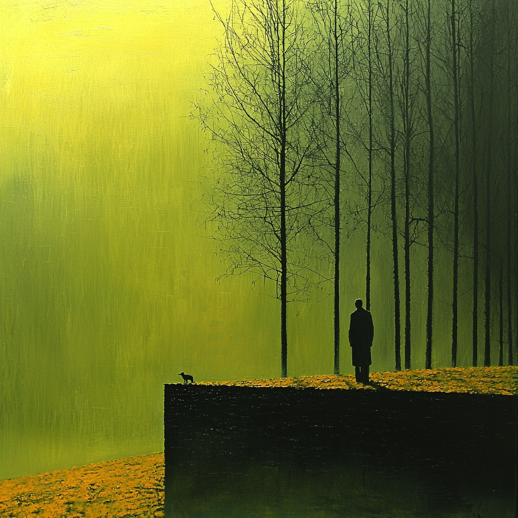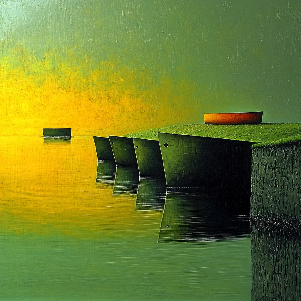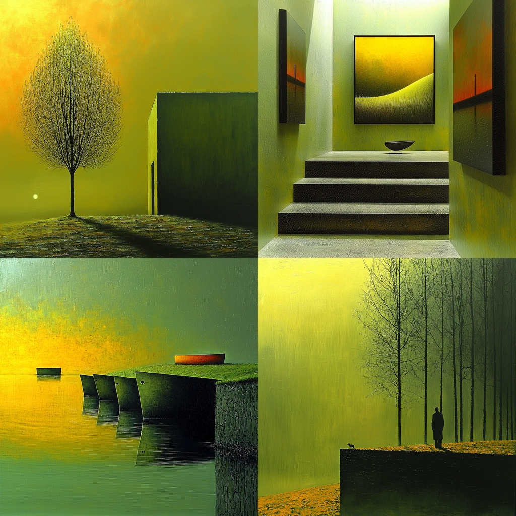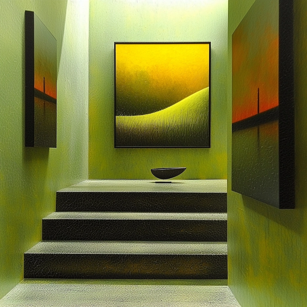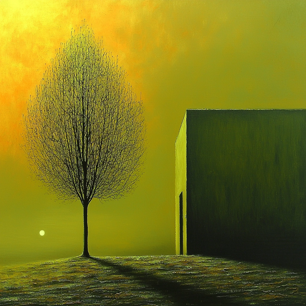 A composition centered on earthy green tones with contrasting yellows, defining light and shadow interactions and depth.