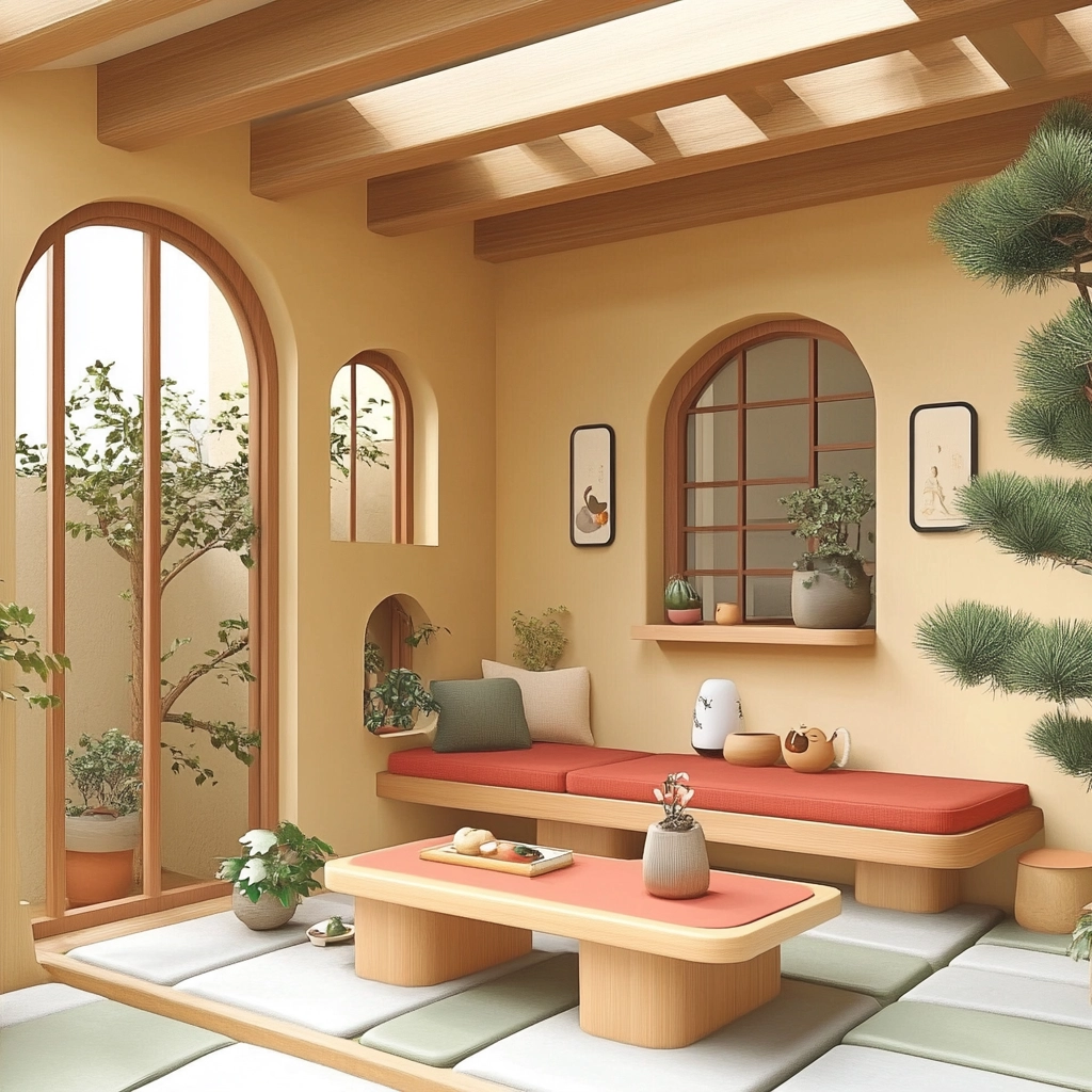 Warm earthy colors dominate the clean, uncluttered space with gentle lighting enhancing minimalistic forms.