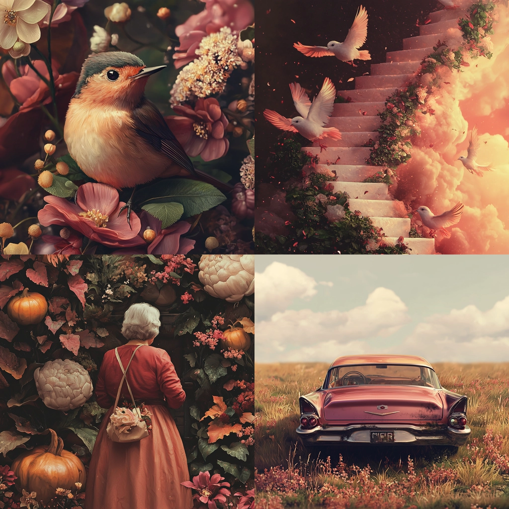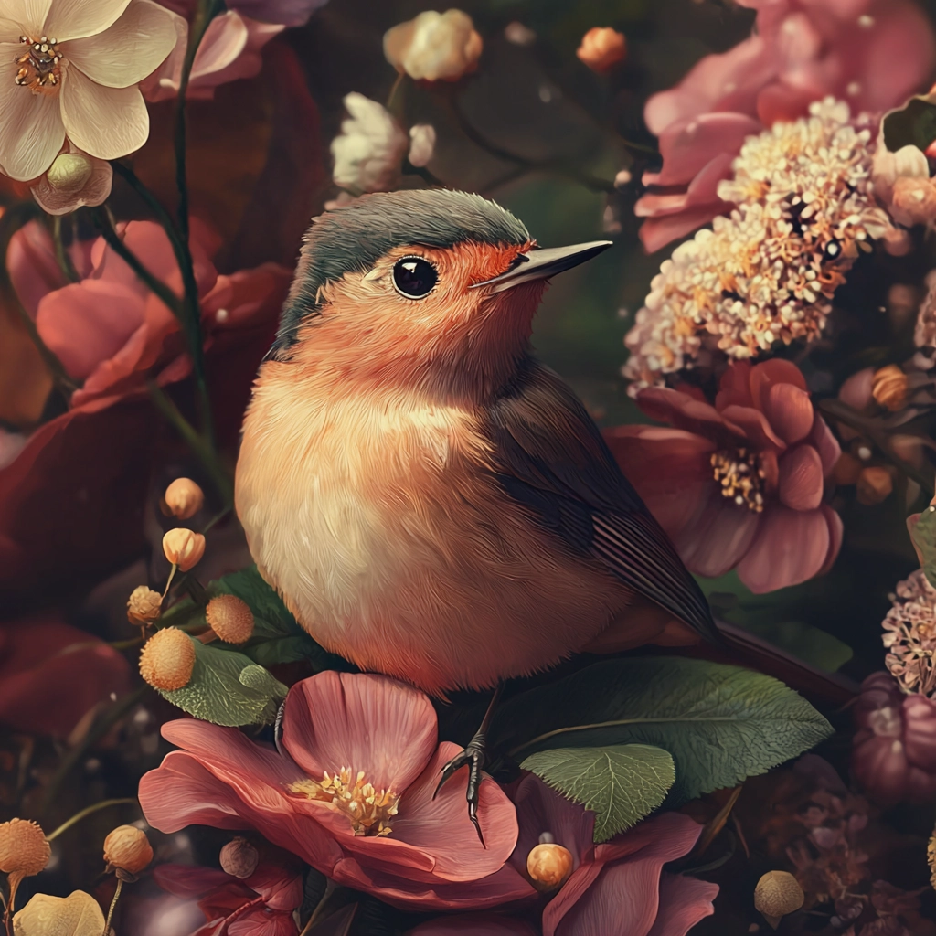 Lighting imbues warmth, enhancing vivid colors and depth. Textures show fine detail, creating tangible surfaces. Composition gives spatial clarity with nuanced transitions between foreground and background elements.