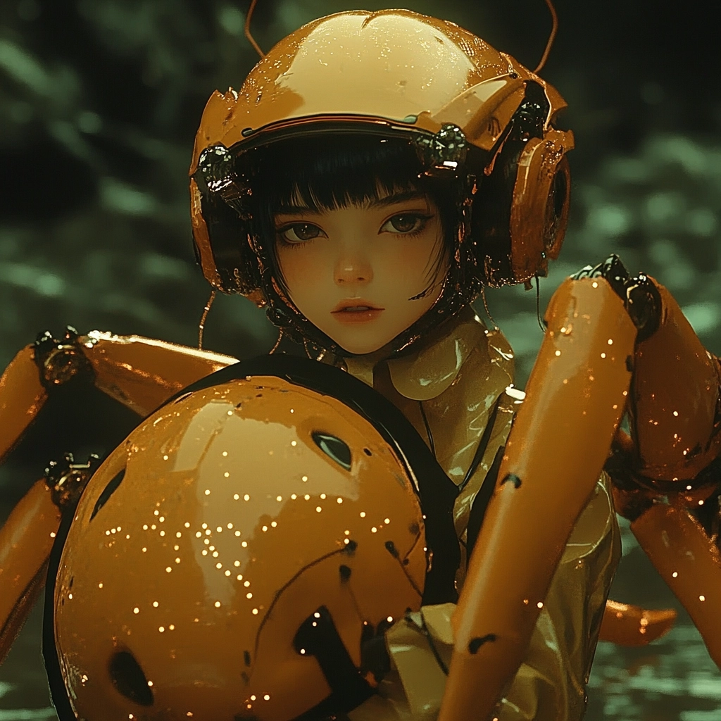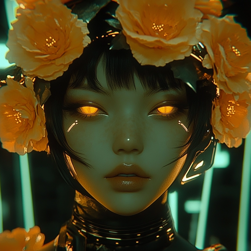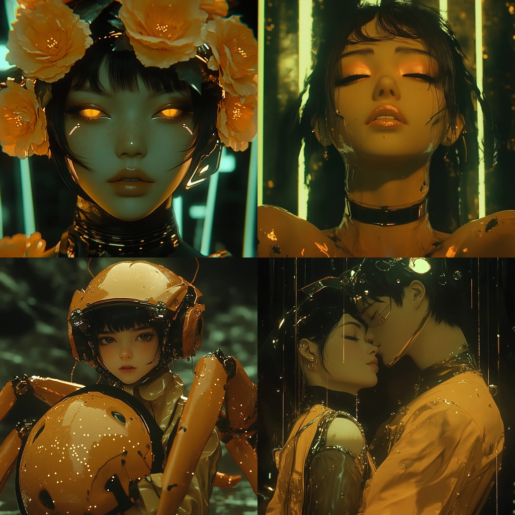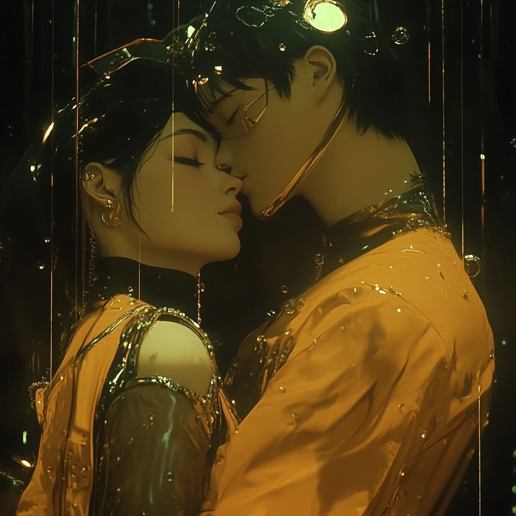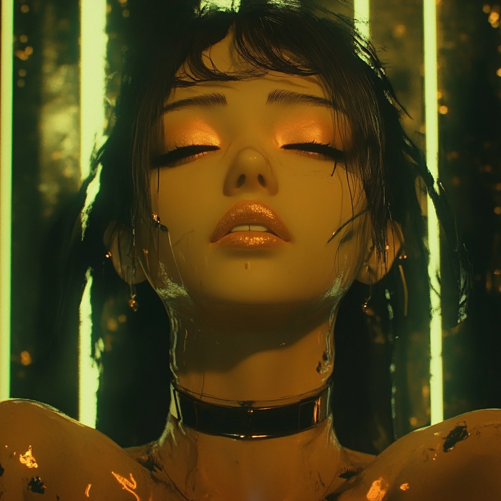Lighting accentuates the surfaces, creating a polished and vibrant glow. The interplay of warm and cooler hues forms a dynamic contrast, enhancing the futuristic ambiance with sleek, reflective textures and depth in the composition.