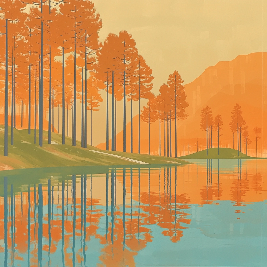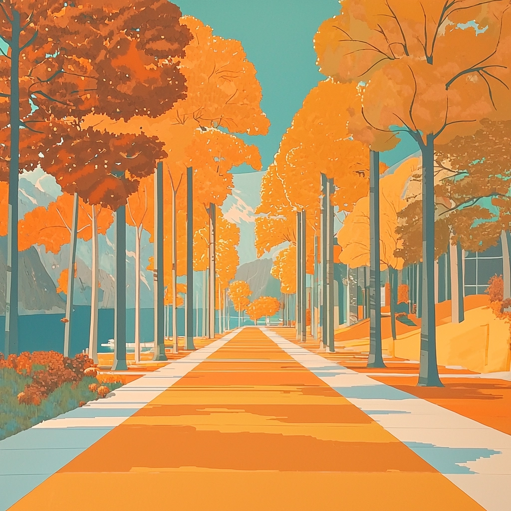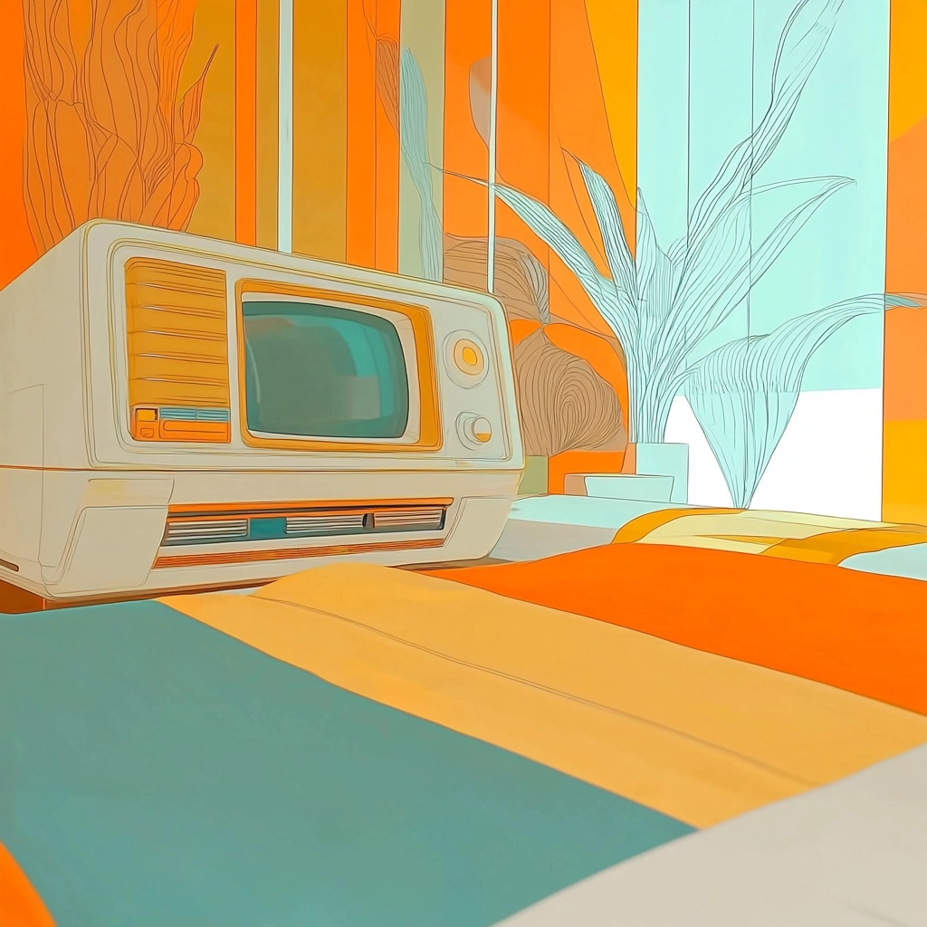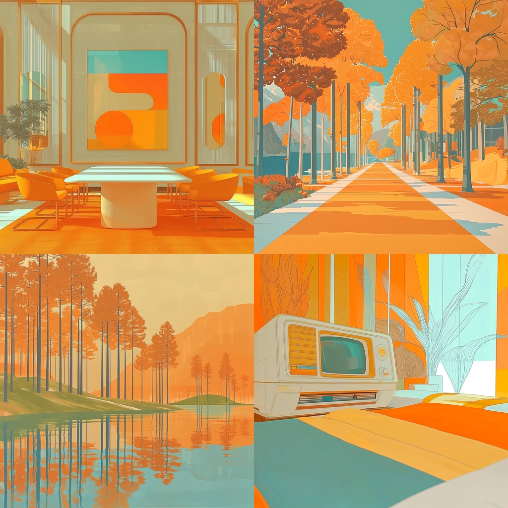 Light is rendered with consistent brightness affecting all elements evenly, emphasizing flatness over volume. Colors are saturated but limited in range, with orange dominating background and midground, offset by blues and beiges which create visual breaks. Space is organized through parallel lines and repetitive patterns, generating a sense of order and rhythm. Textures are smooth and uniform, lacking roughness or strong grain, contributing to a polished, graphic appearance.