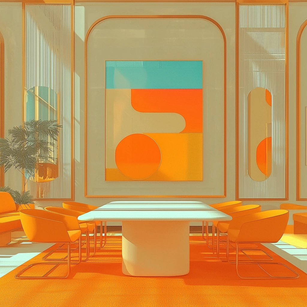 Uses dominant warm orange tones balanced by cool blue and beige with sharp geometric lines and flat color planes creating clear spatial divisions and layered depth.