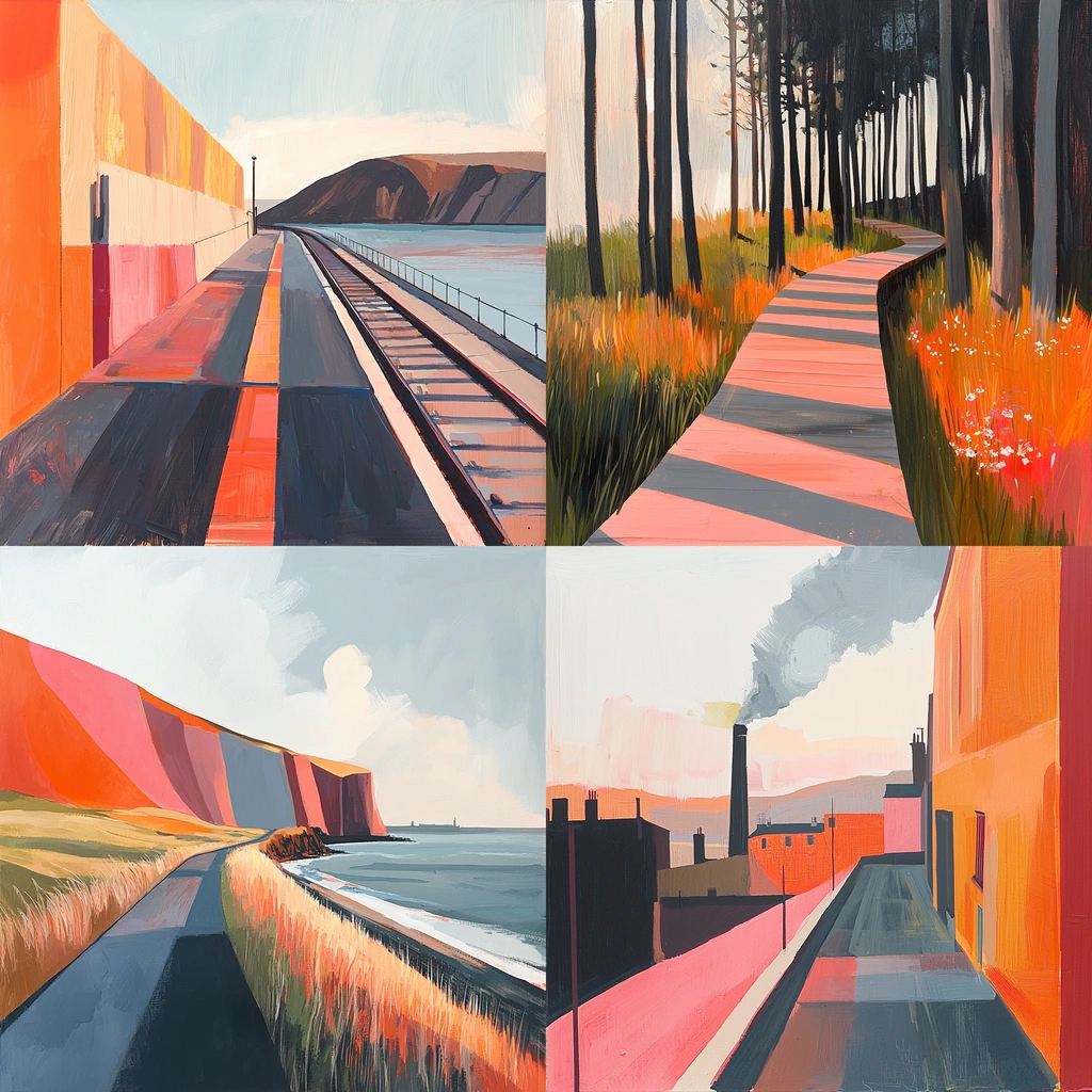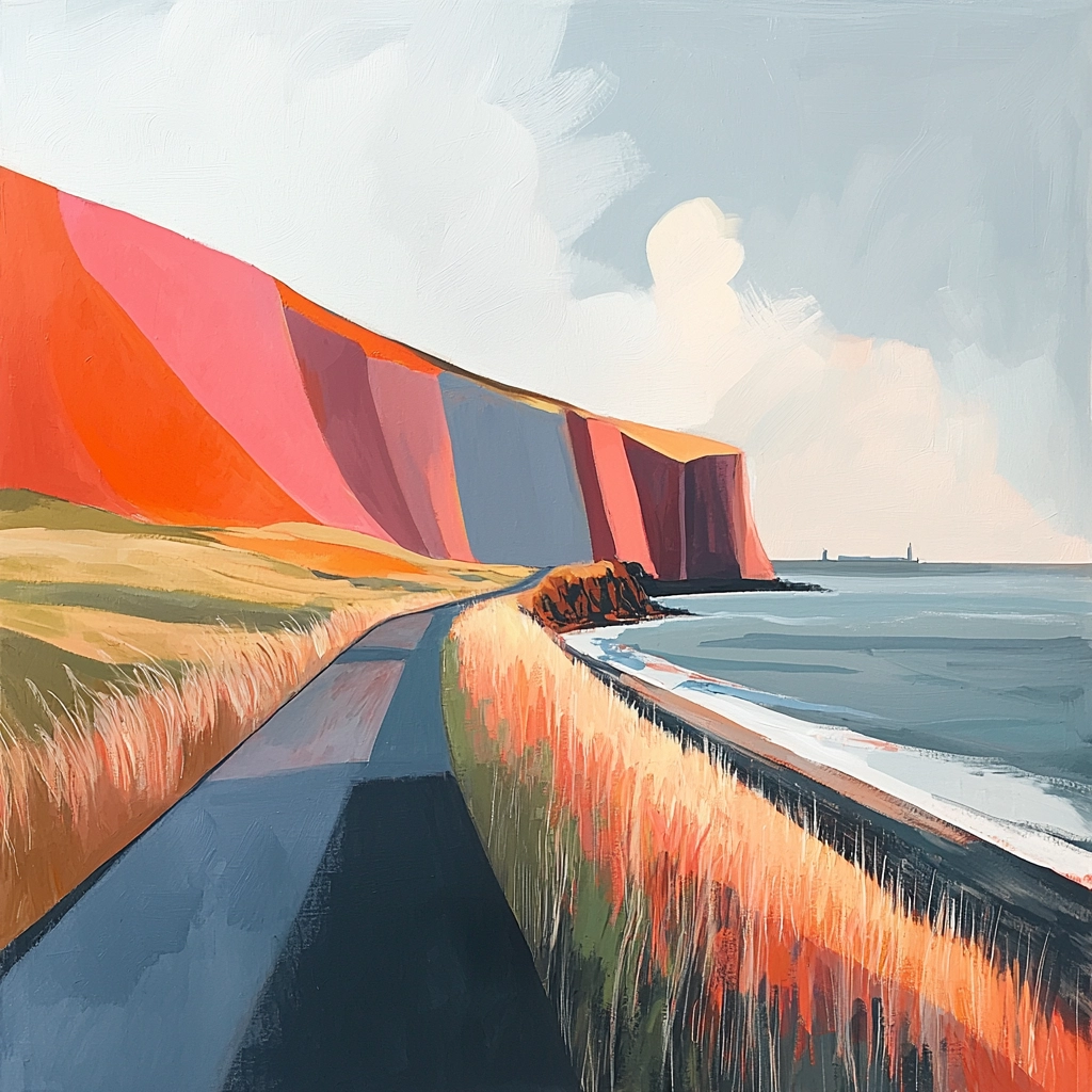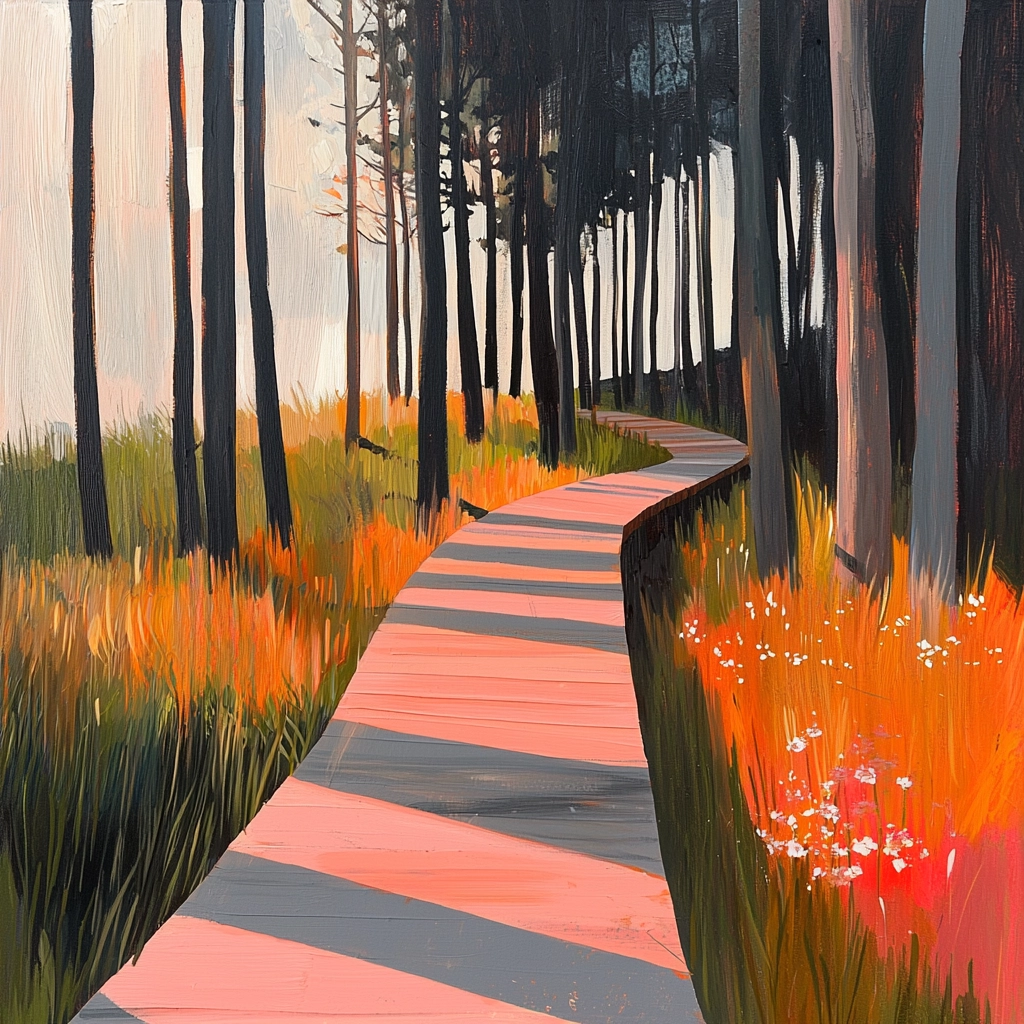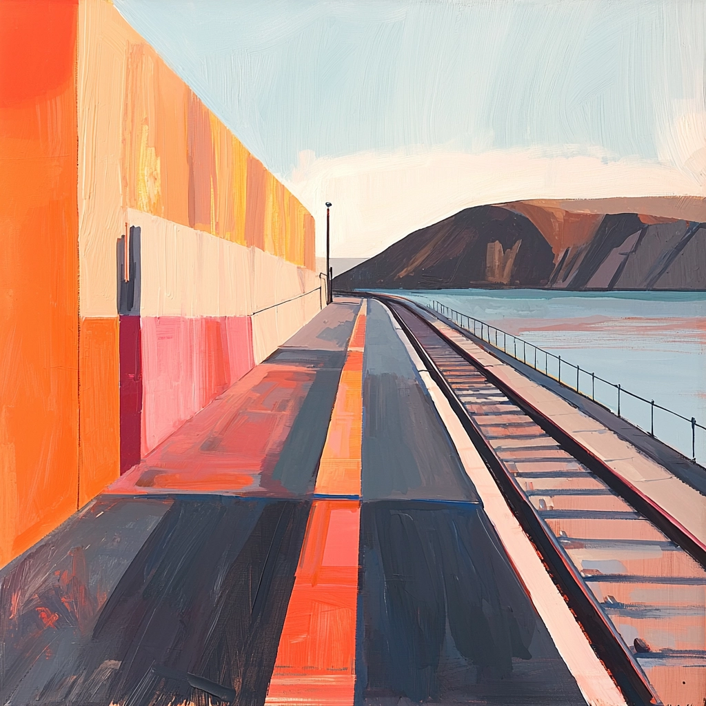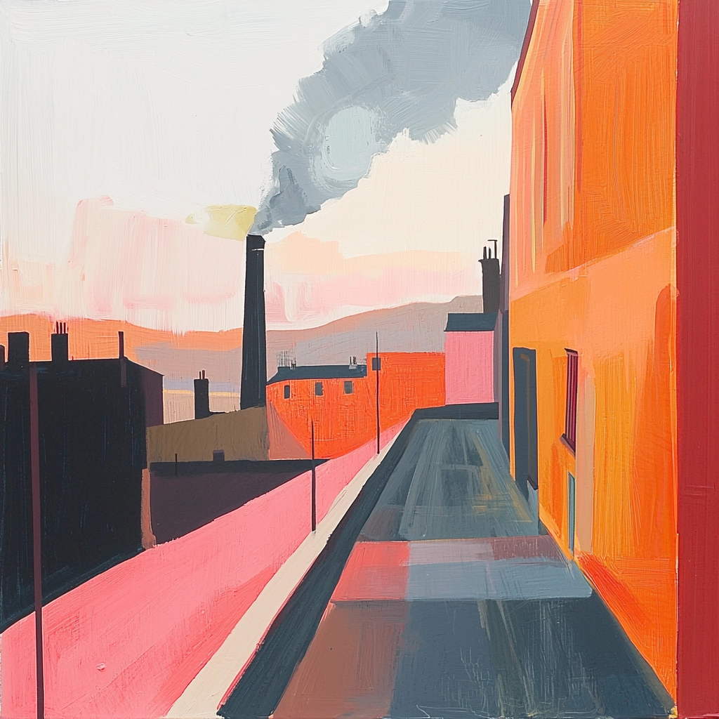Bold use of warm colors and linear composition creates distinct planes and forms.