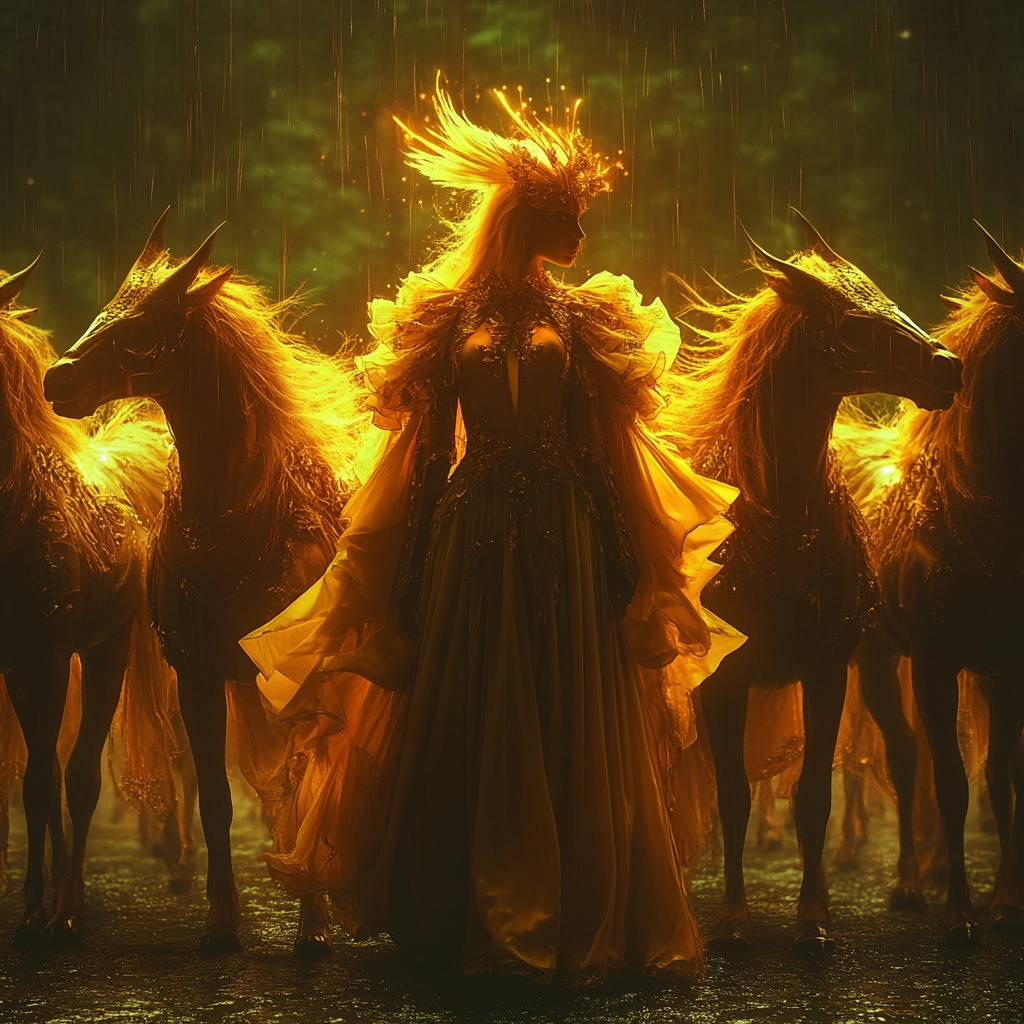 A golden radiance permeates each scene, blending realism with a fantastical aura through intricately rendered details.