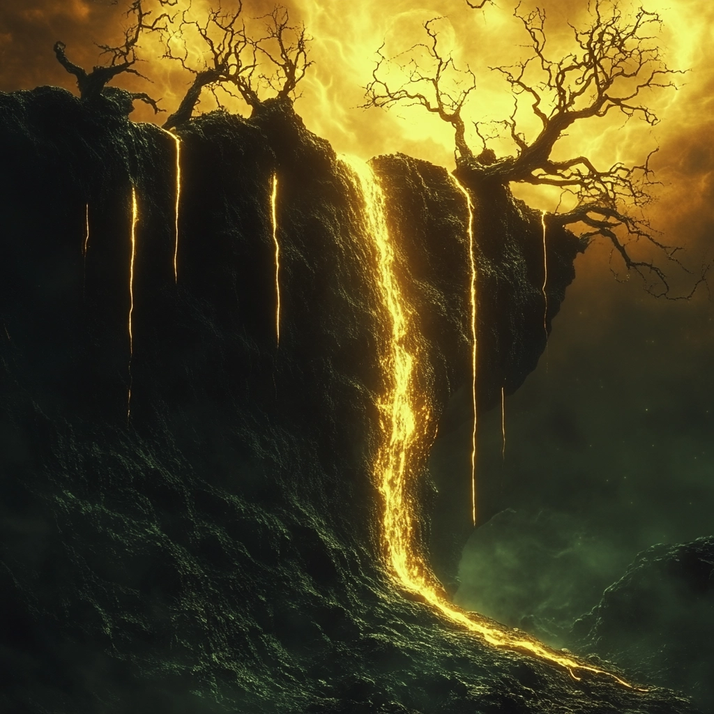 The interplay of light and shadow creates a dramatic atmosphere, with golden hues enhancing the depth and texture of each element. Rich contrasts highlight the dimensionality and emphasize the intricate details subtly lit by an omnipresent glow.