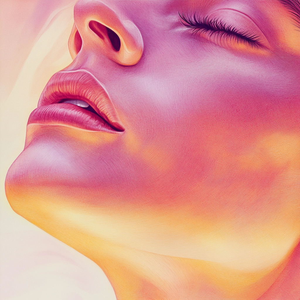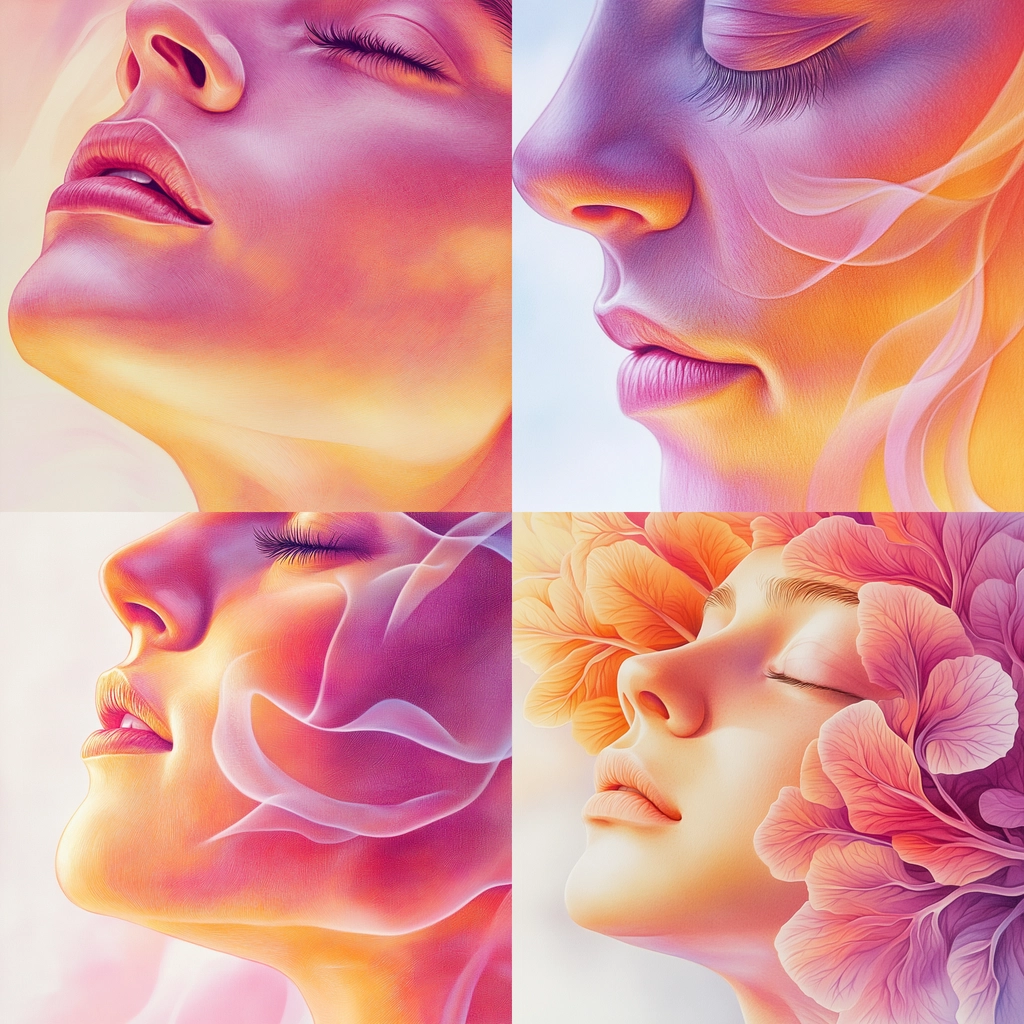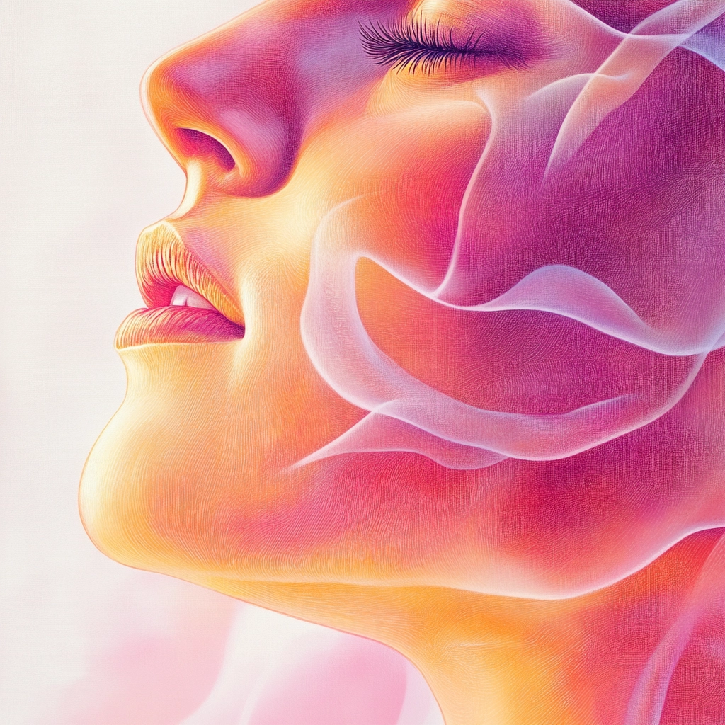 Soft lighting effects enhance the gradient transitions between pink, orange, and purple, creating a smooth spatial flow. The textures of floral elements add intricate detail and depth to the flat areas.