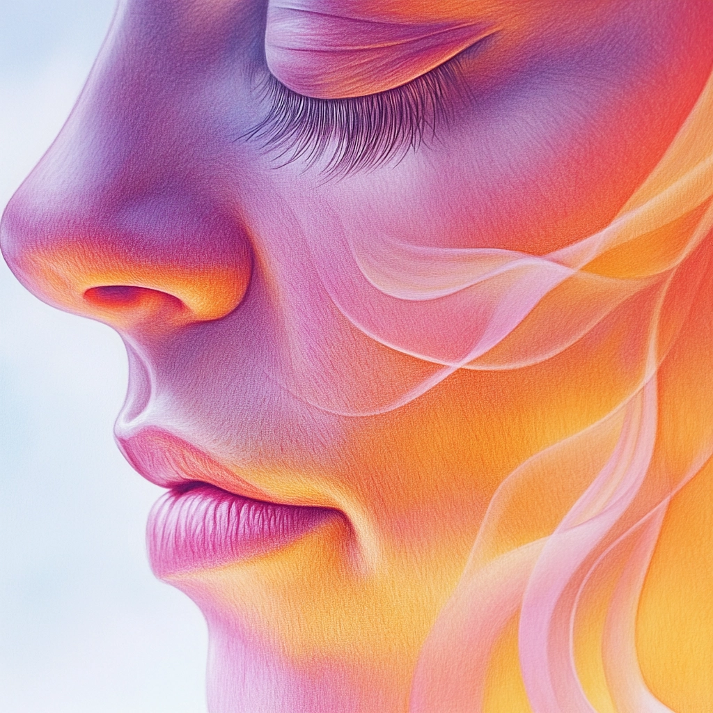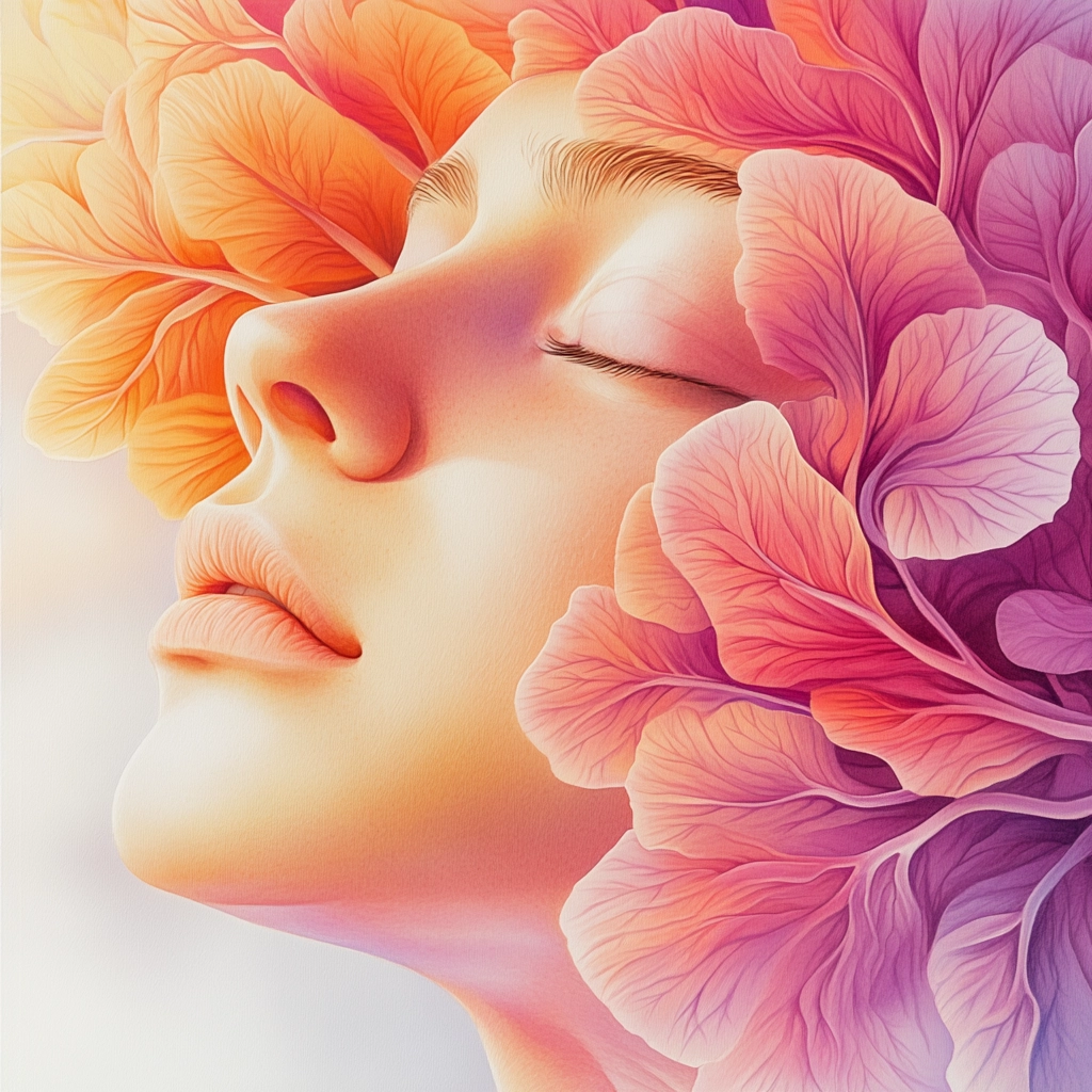 This piece blends warm gradients with soft floral motifs in a cohesive composition.