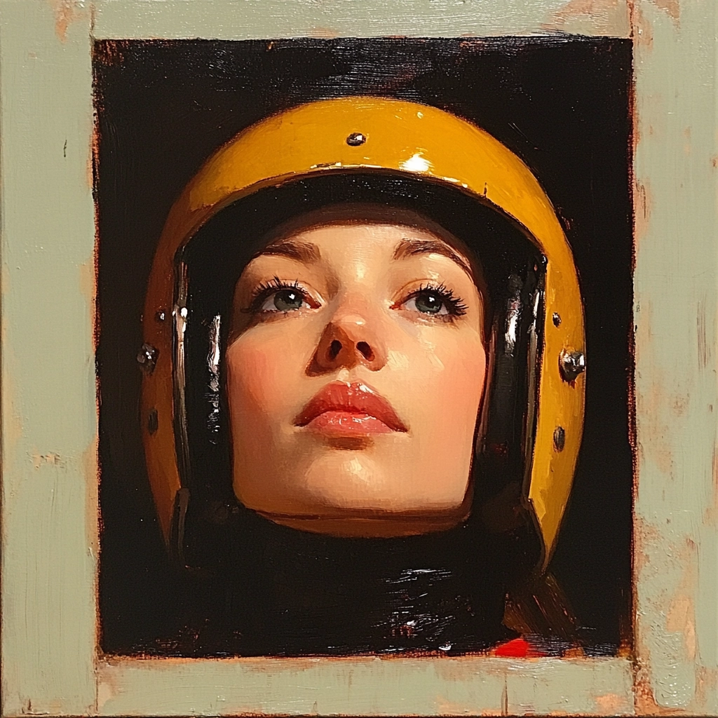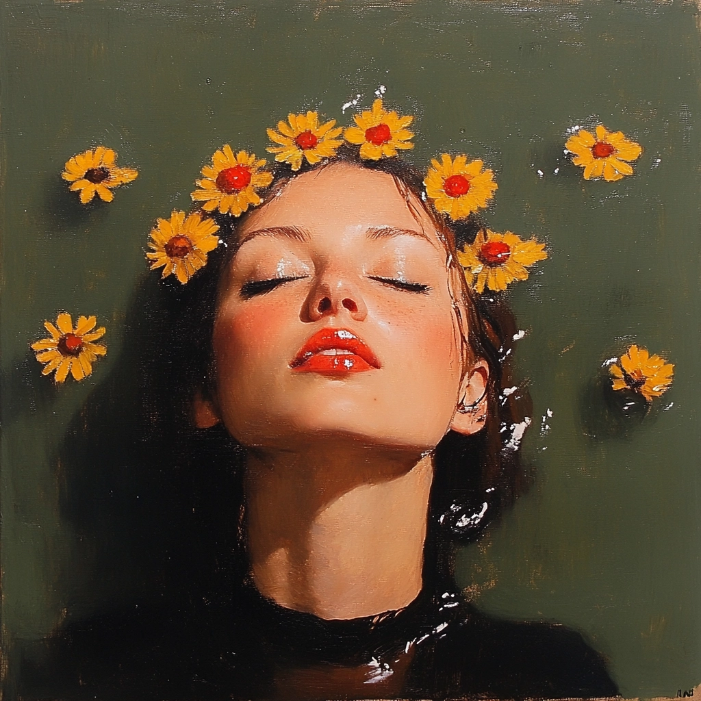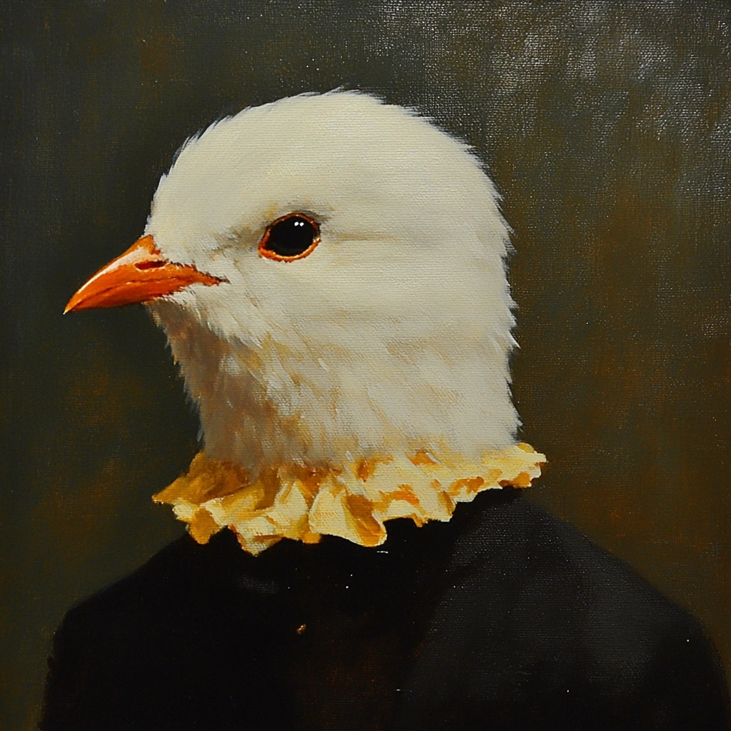 Warm tones contrast against a dark, muted background with a naturalistic depiction.