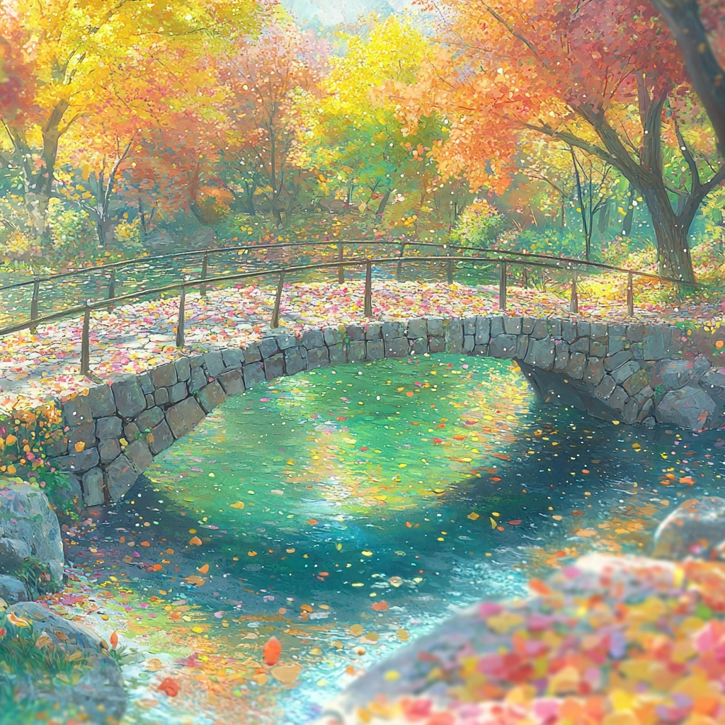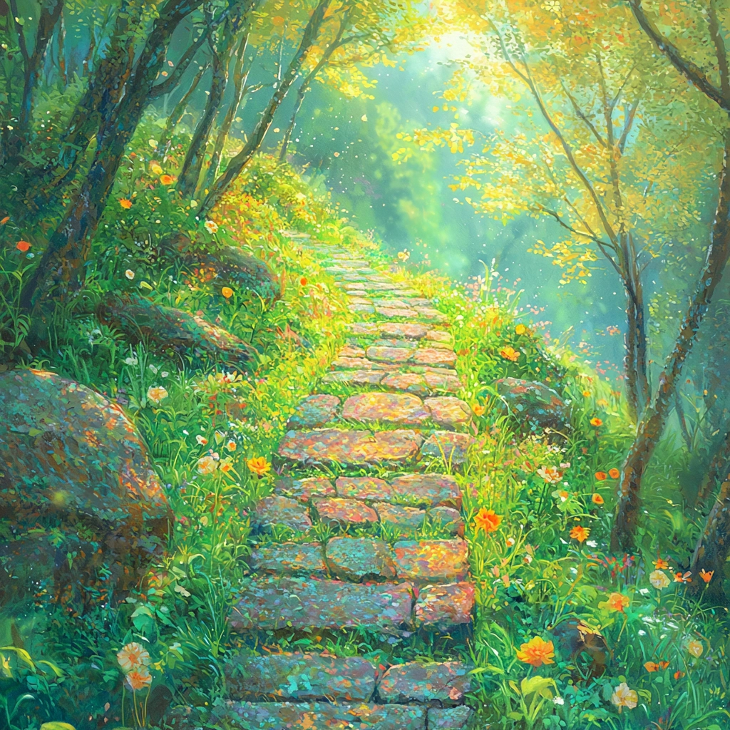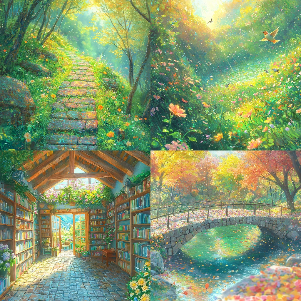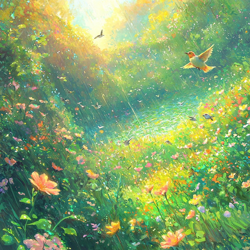 Soft, diffused lighting creates a gentle glow with delicate, fine textures; vivid green and warm yellow enhance the sense of depth amidst the verdant scenery, accentuated by splashes of orange.