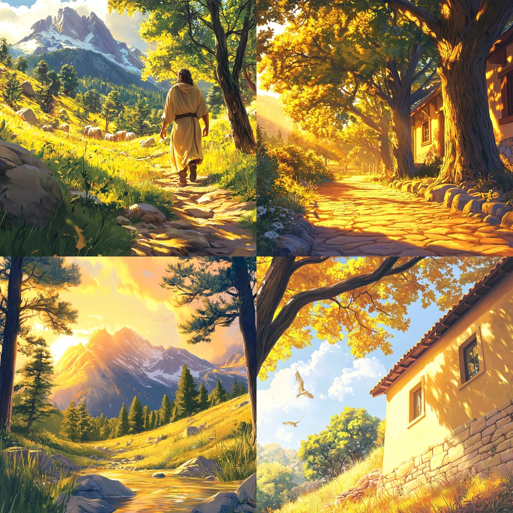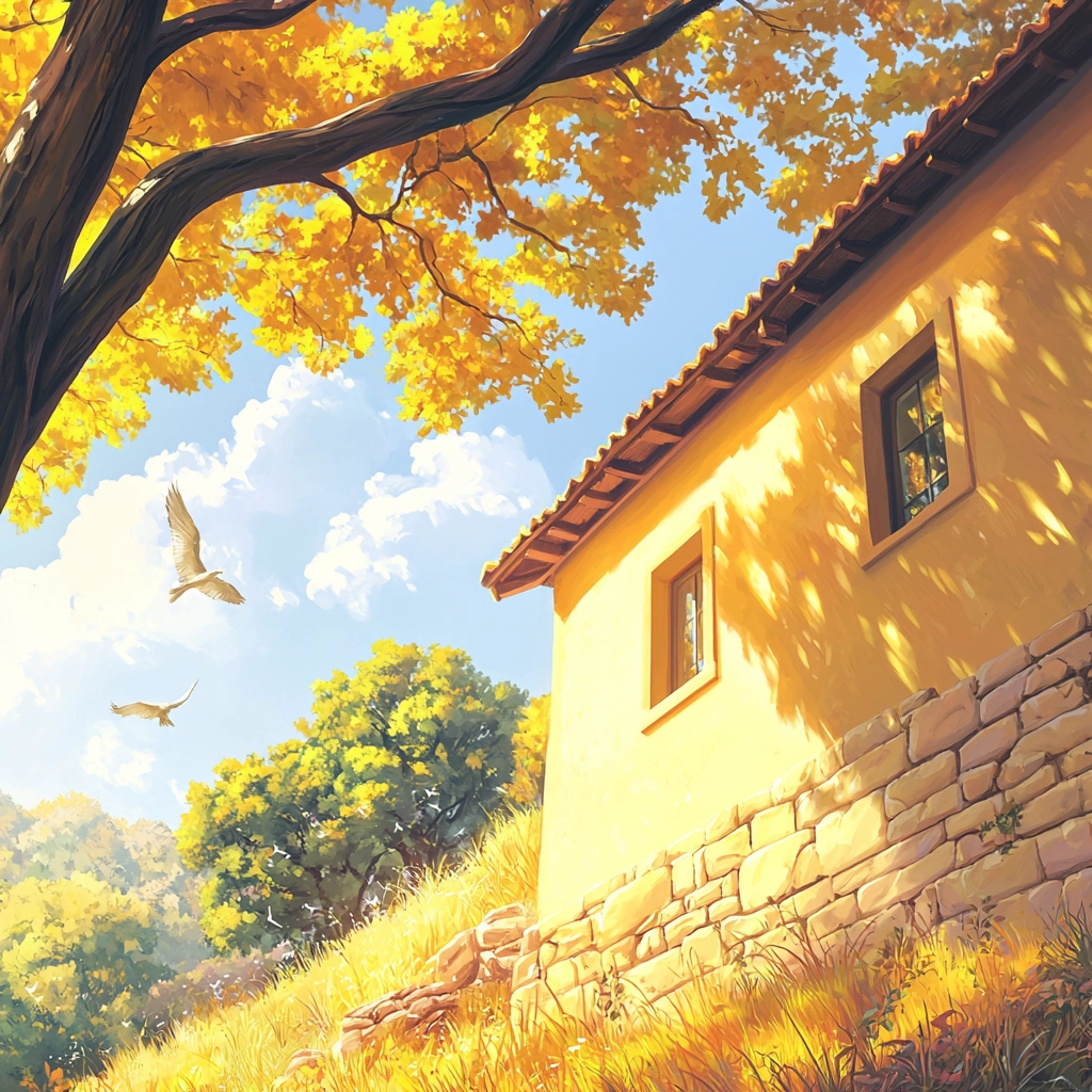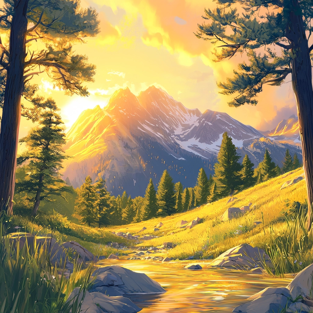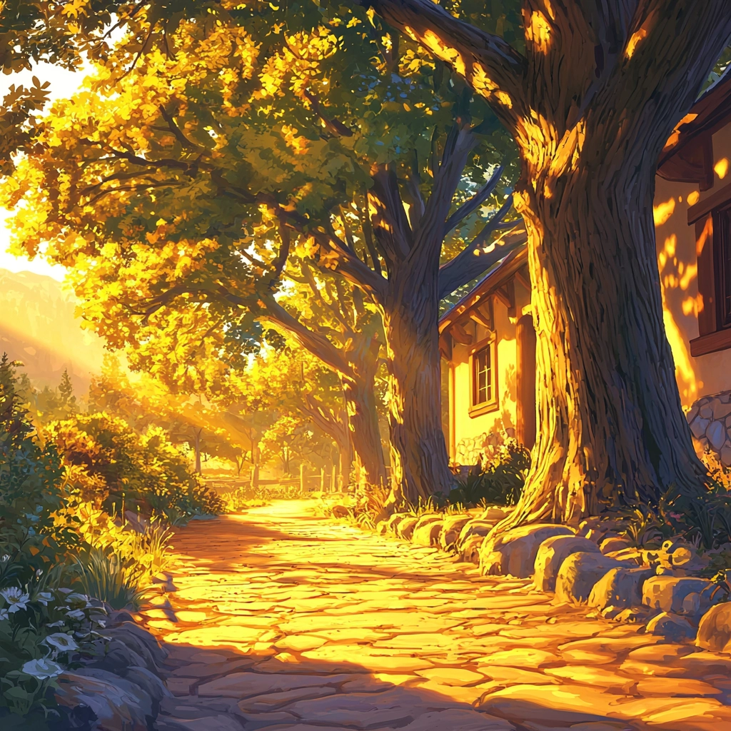 The lighting effects create a warm and vivid atmosphere, enhancing the saturated colors and depth. The interplay of light and shadow defines textures and adds a sense of space, while soft brushwork portrays the natural environment effectively.