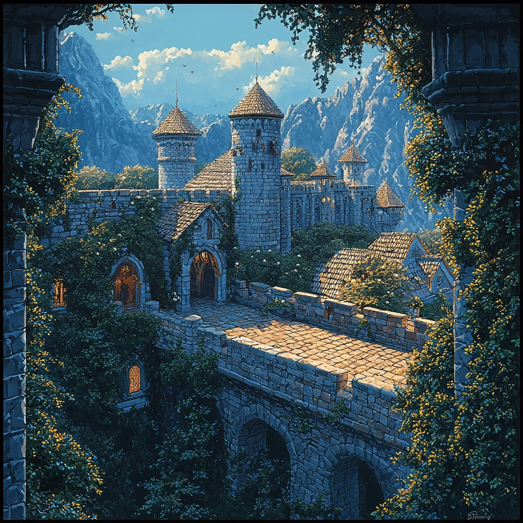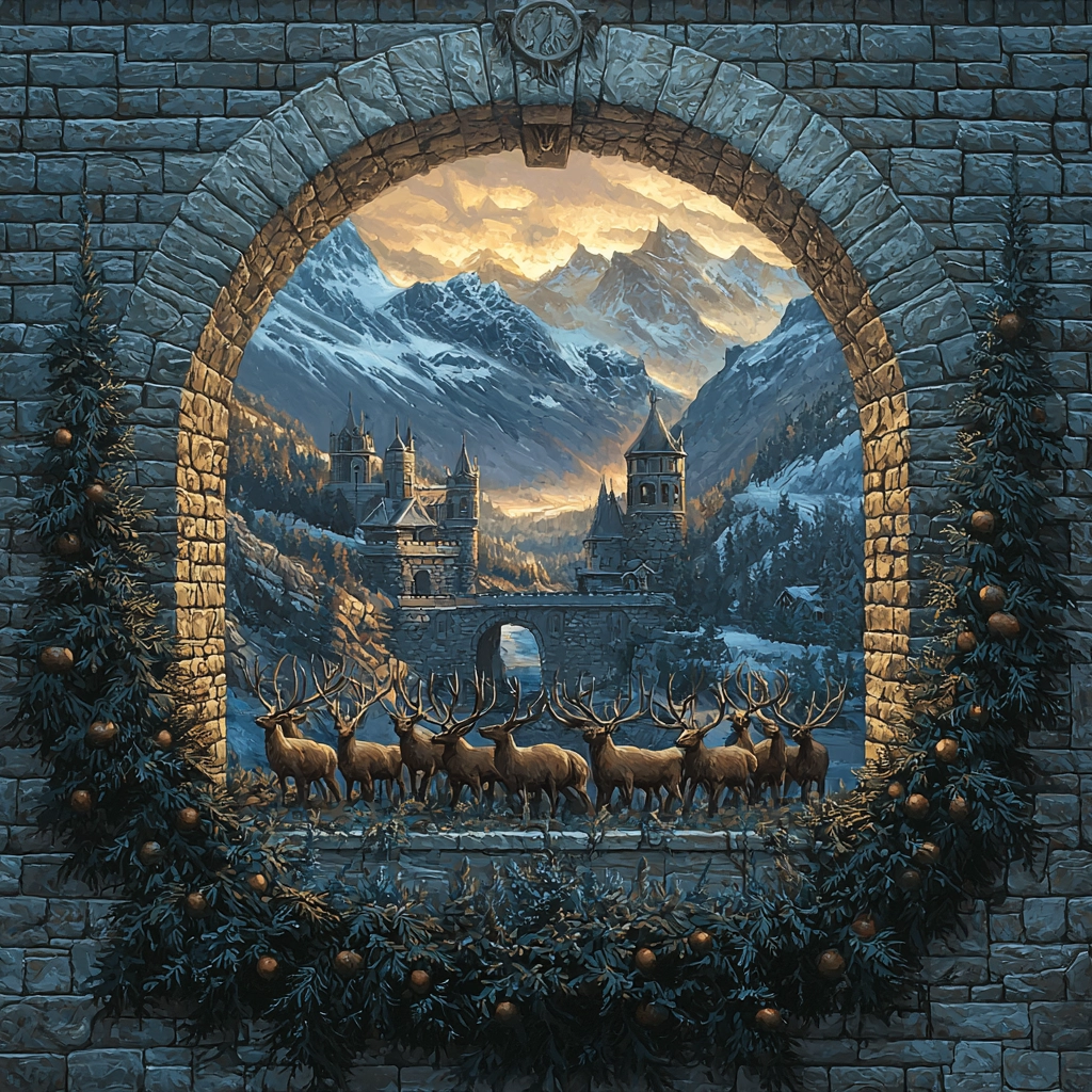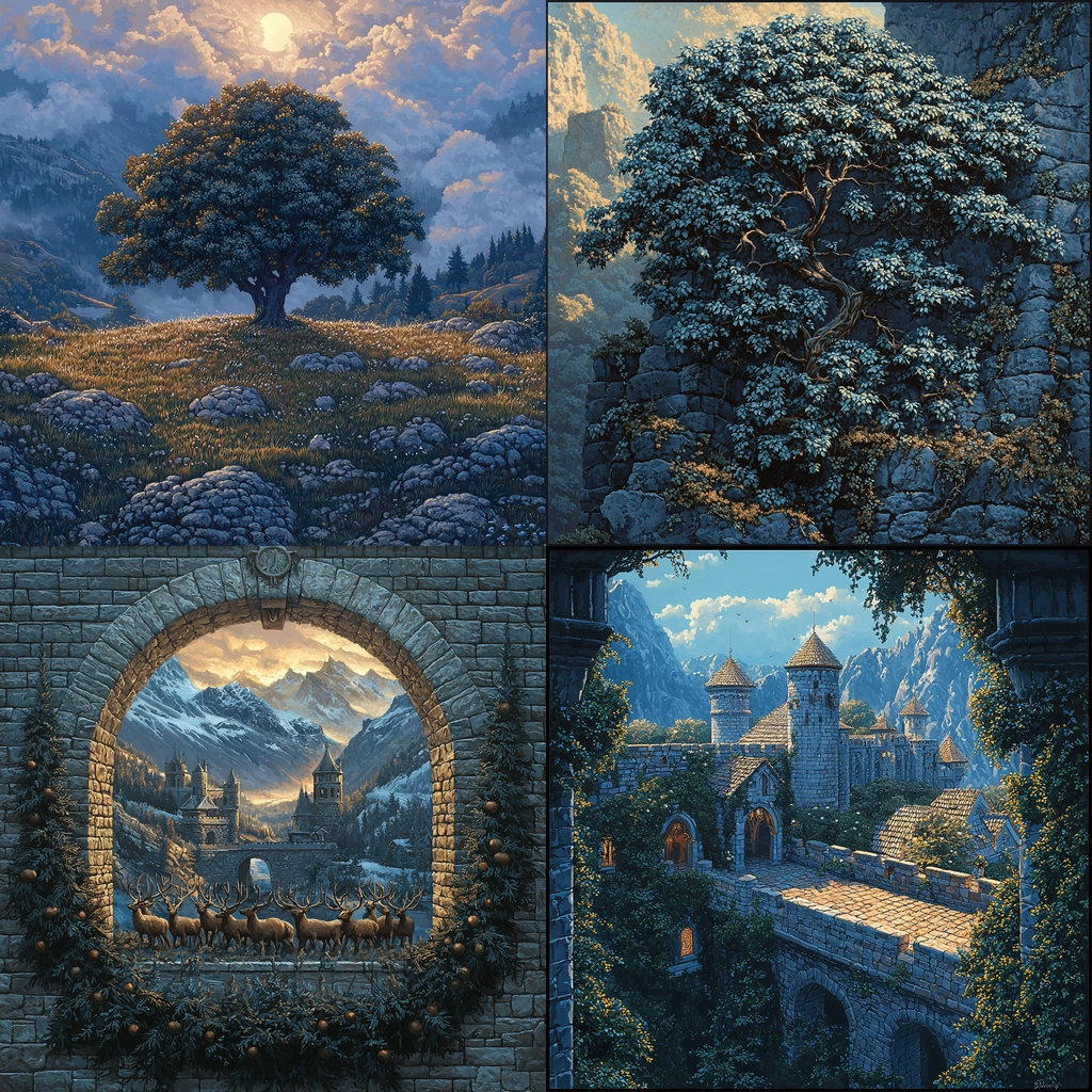 The lighting effects highlight intricate detailing and textured surfaces, giving a sense of depth and dimensionality. The colors blend harmoniously with balanced contrasts between dark and light areas, creating strong spatial perspectives. The textures are rich and varied, showcasing meticulous craftsmanship in the rendering of surfaces.