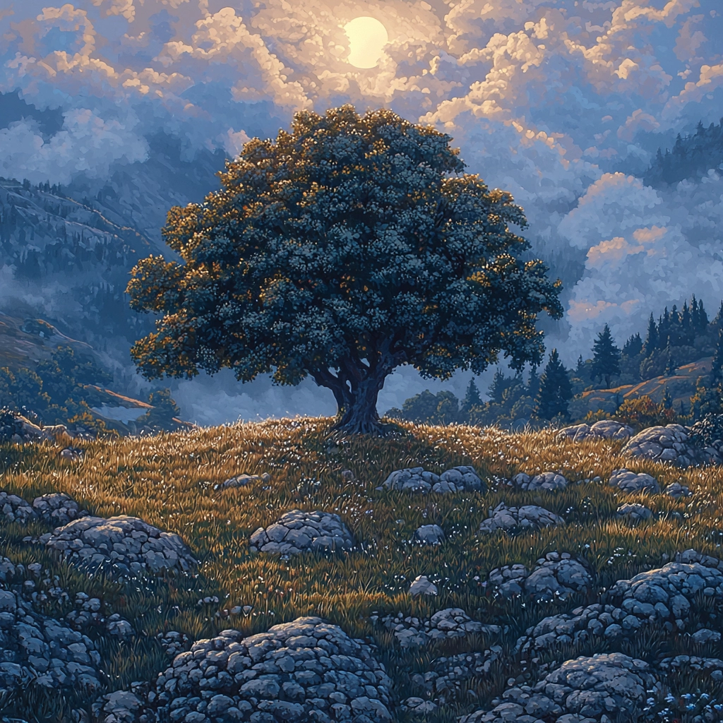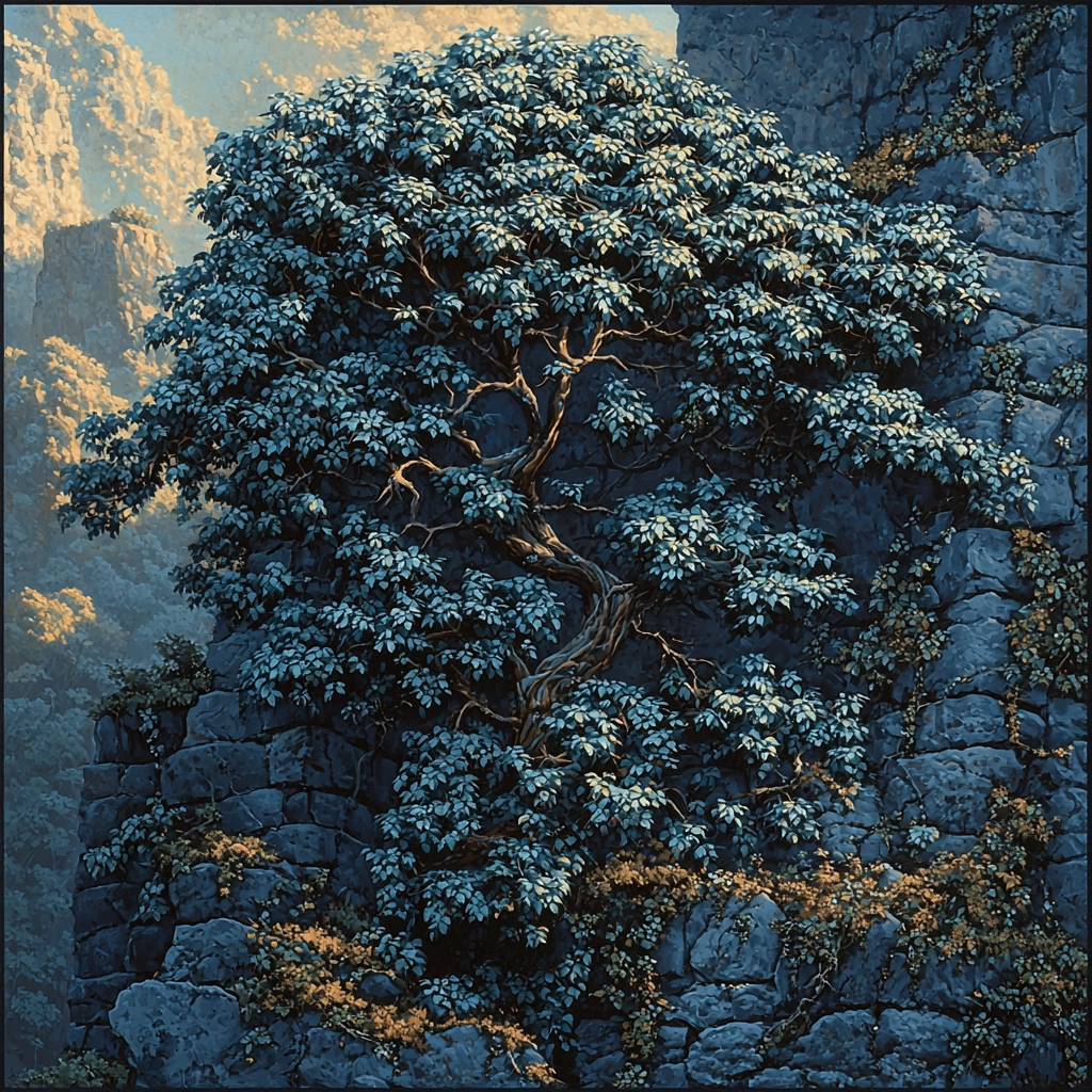 The use of warm lighting creates a realistic and textured composition, emphasizing depth through contrasting hues.