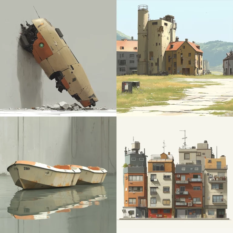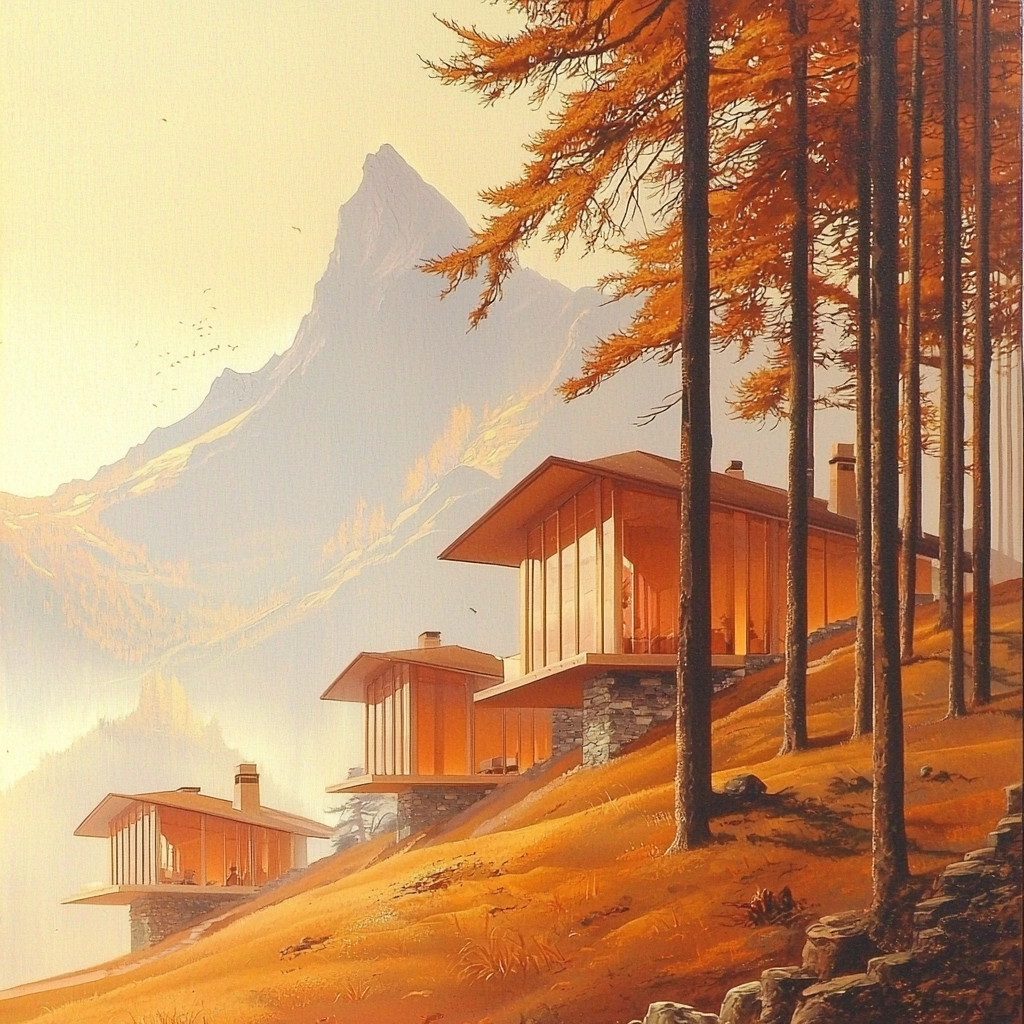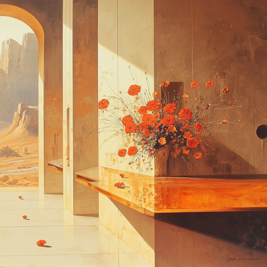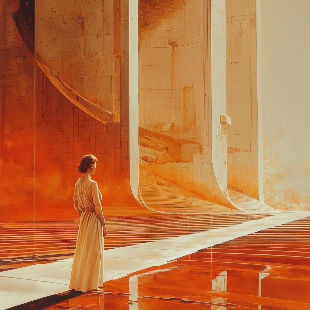The use of soft lighting creates an inviting ambience with gradients of orange and beige enhancing the minimalist structures. The composition emphasizes balance through clean lines and expansive spatial arrangements, highlighted with naturalistic textures in selective areas.