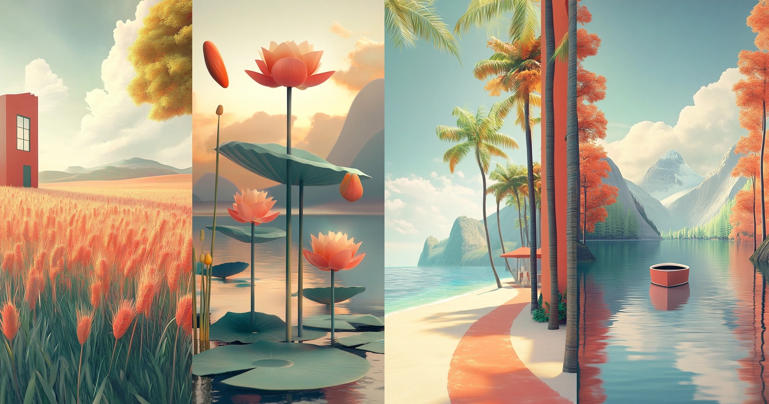 The art exhibits a harmonious blend of warm tones and fluid compositions, with a picturesque quality.