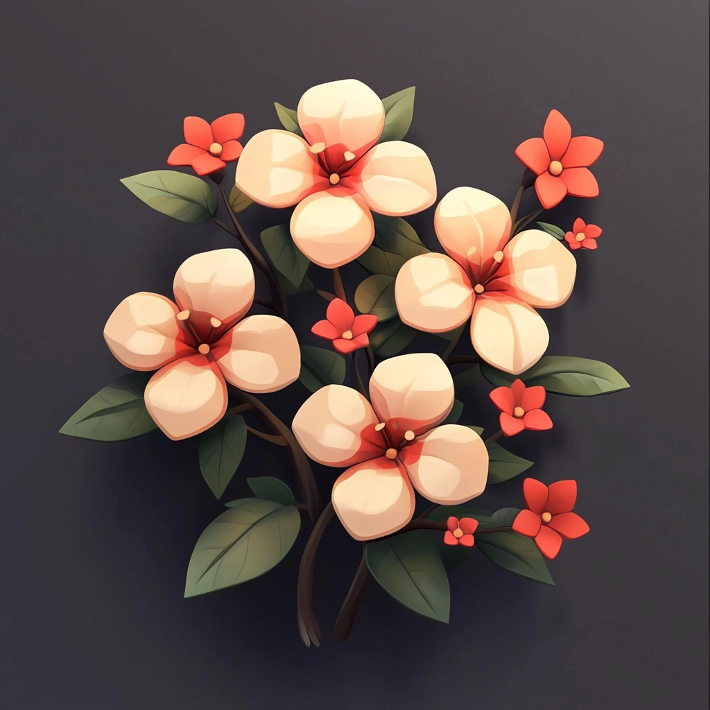 The warm reds and greens are juxtaposed against a dark backdrop, highlighting forms with subtle gradients. Soft lighting illuminates the textures, adding a sense of depth and volume to the layered compositions.