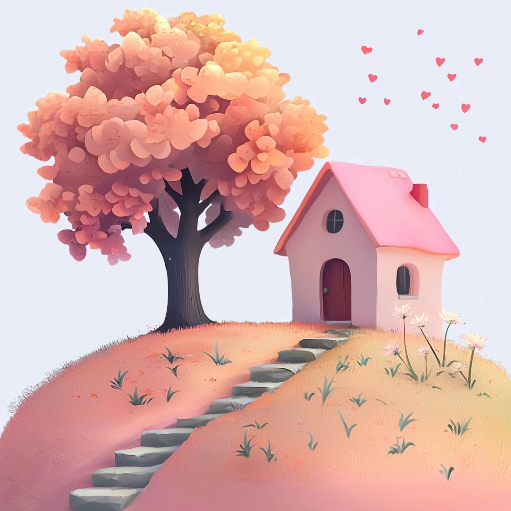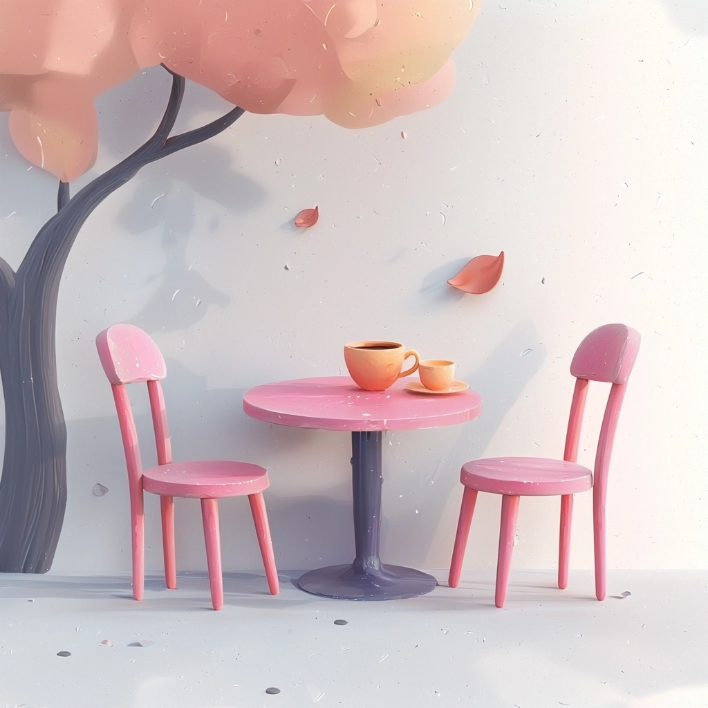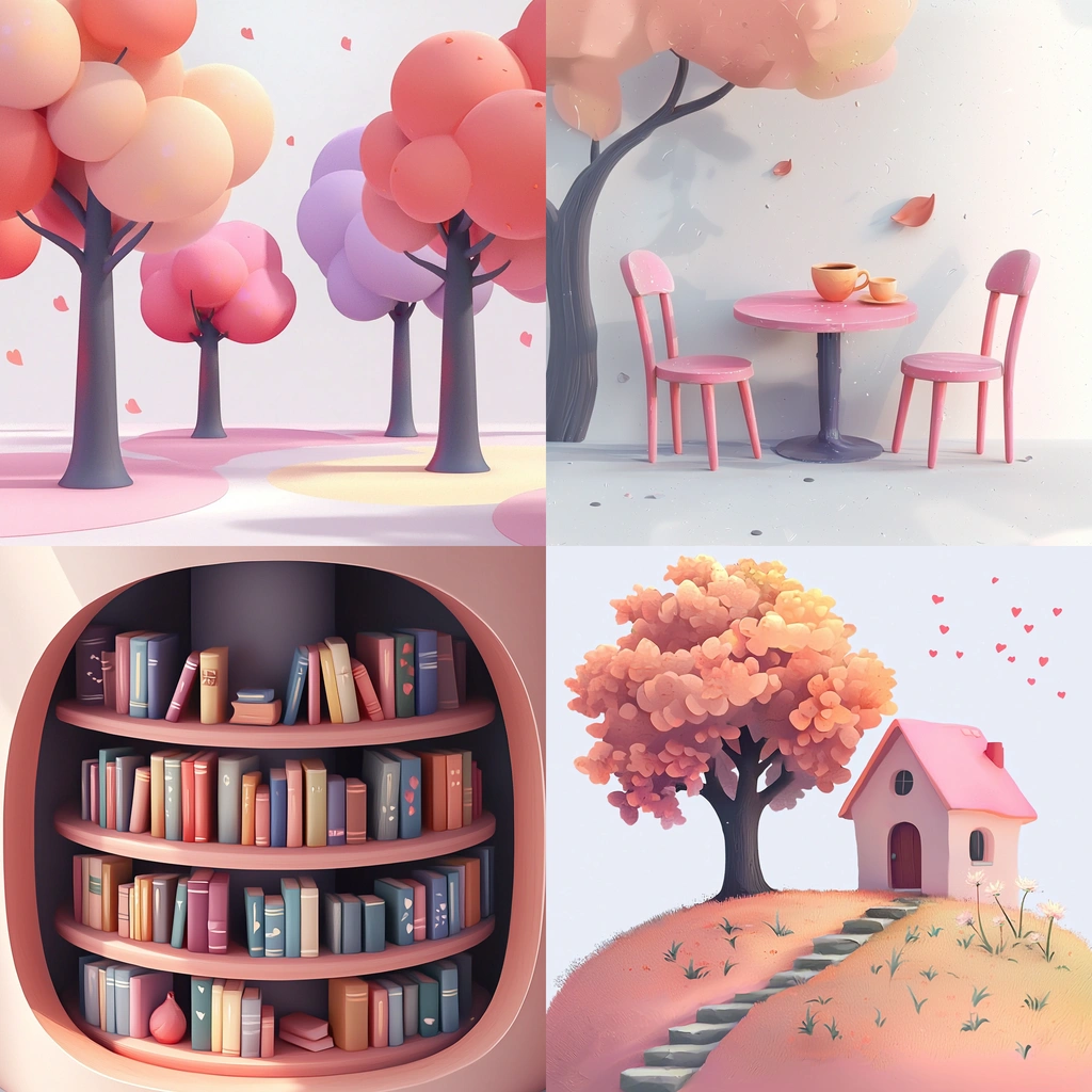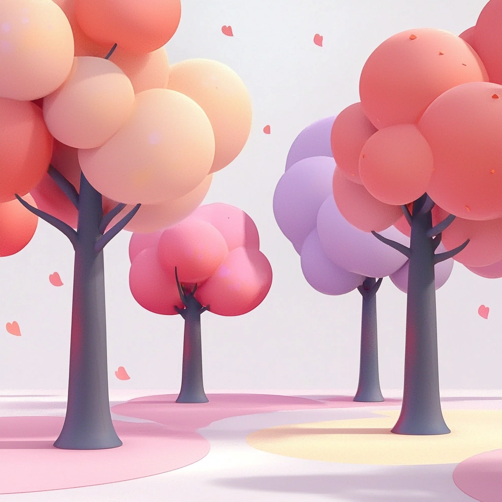 Soft pastel shades with smooth gradients create a warm and inviting atmosphere. Lighting softly highlights elements, giving a gentle three-dimensional appearance. Textures are deliberately smoothed for a cohesive sense of simplicity.