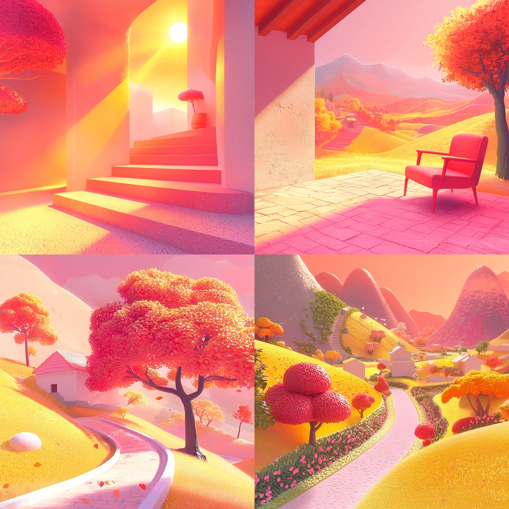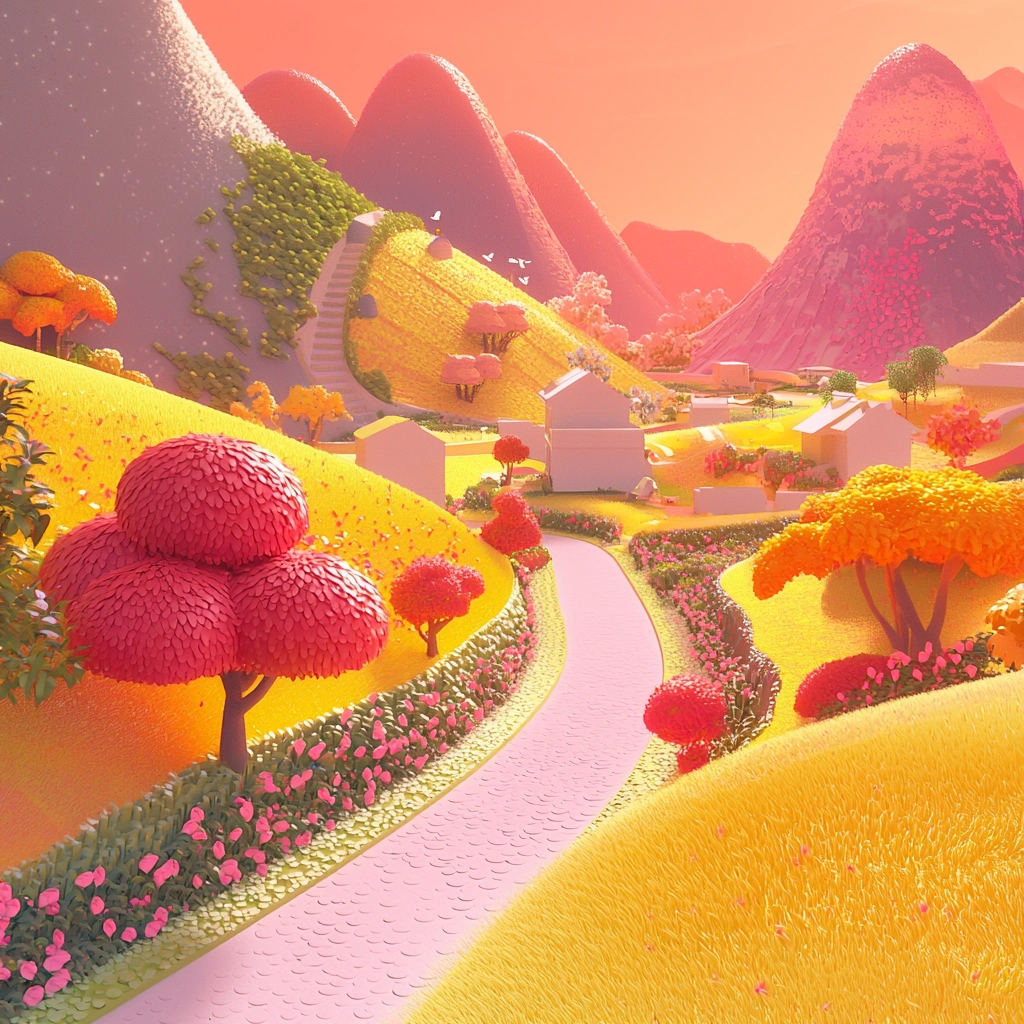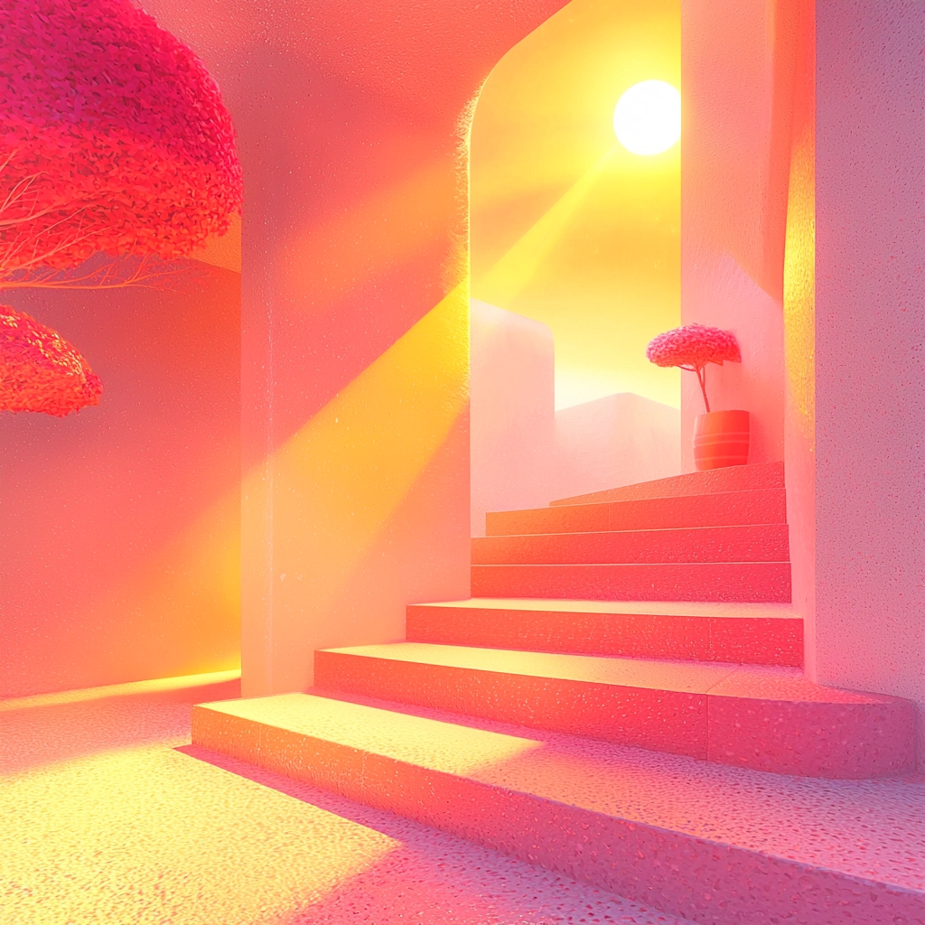 The lighting is soft yet vibrant, with a warm glow accentuating the pastel hues. The colors transition smoothly, enhancing the perception of depth. Textures are subtly expressed, contributing to a sense of gentle undulation and inviting exploration.