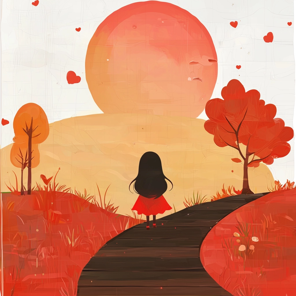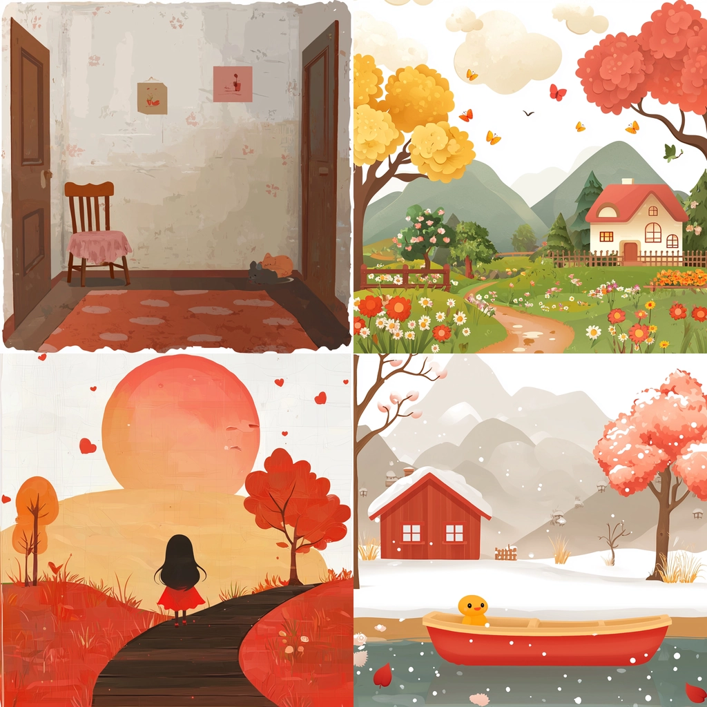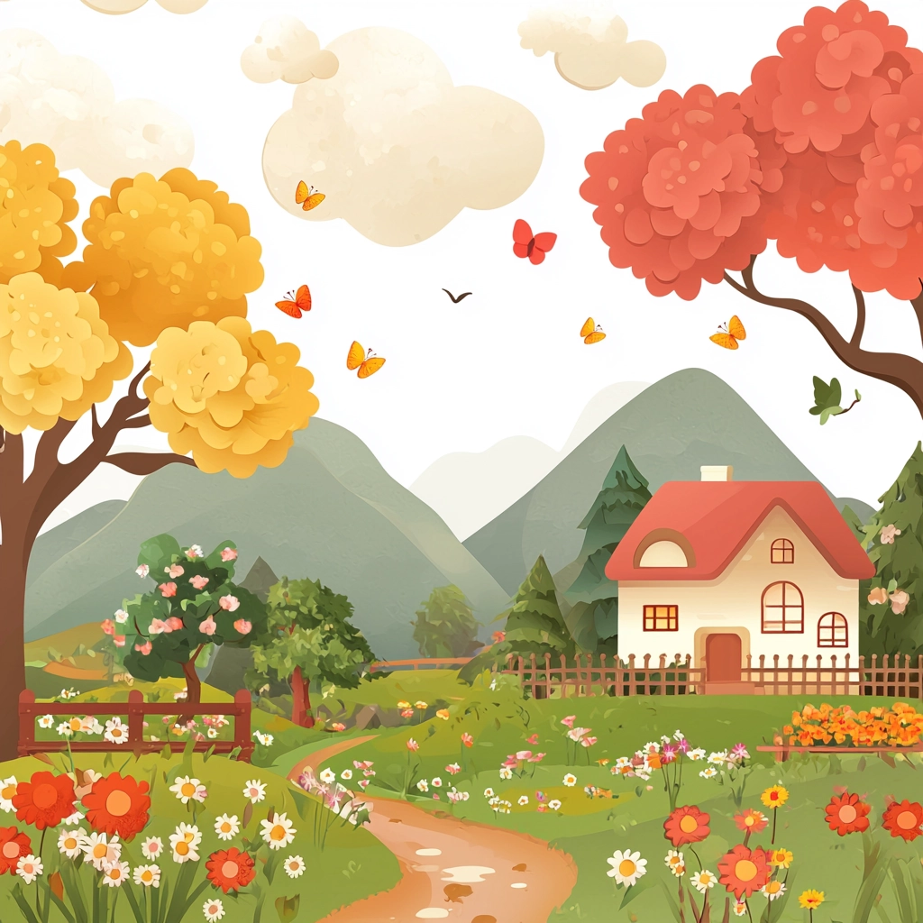 Juxtaposes vibrant seasonal hues with a cozy rural ambiance, emphasizing warmth.