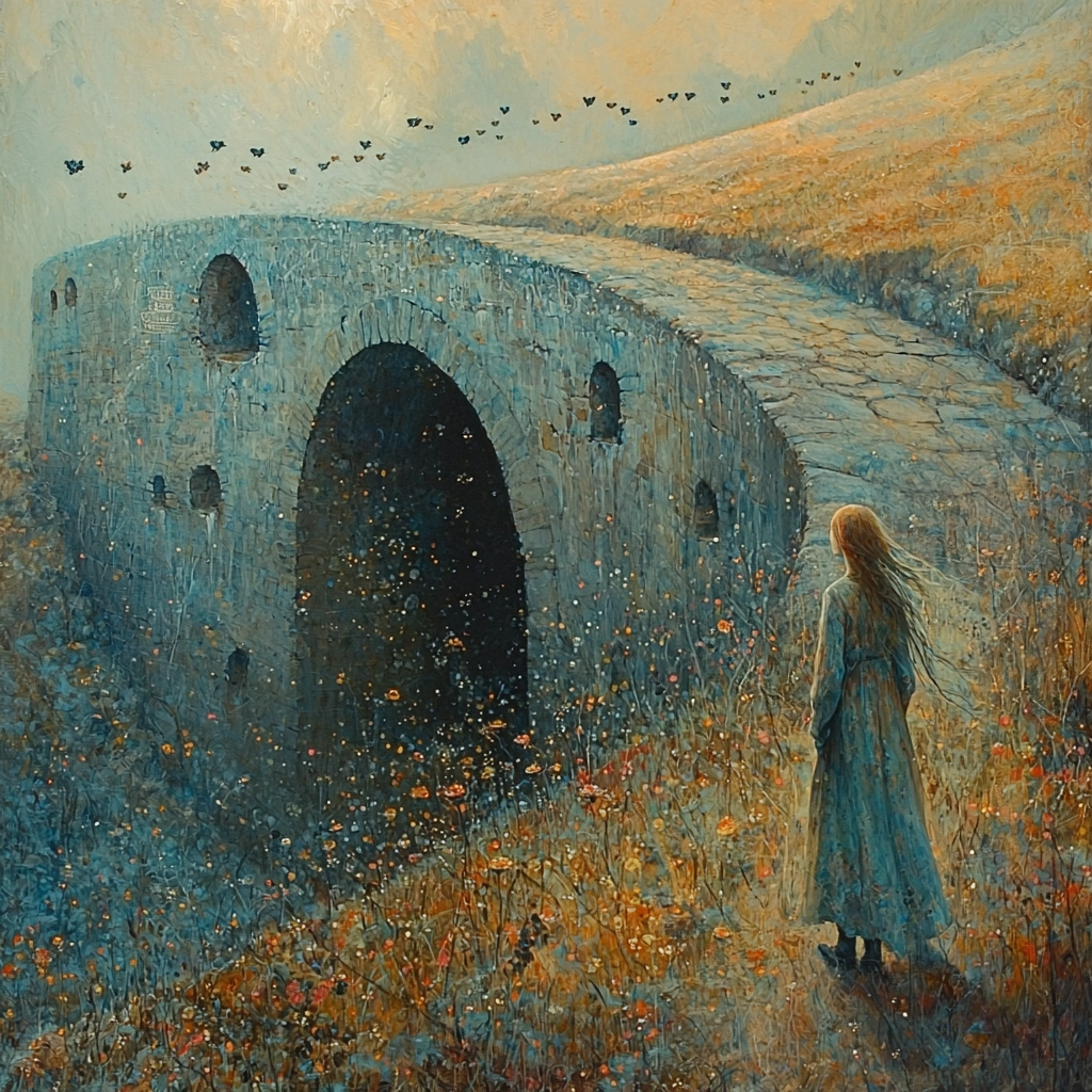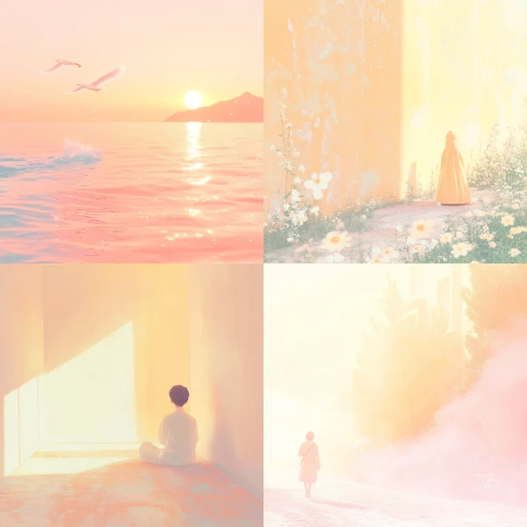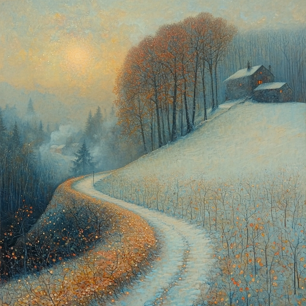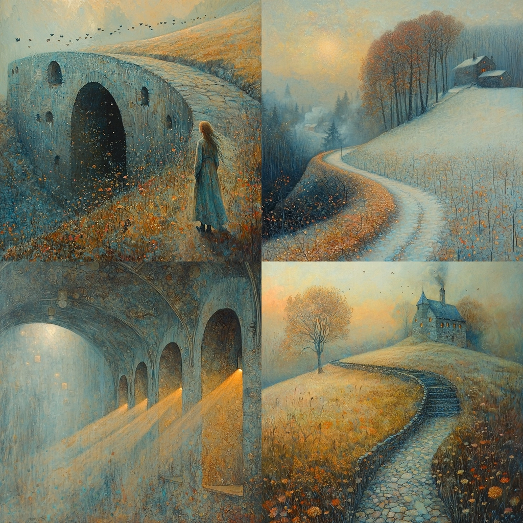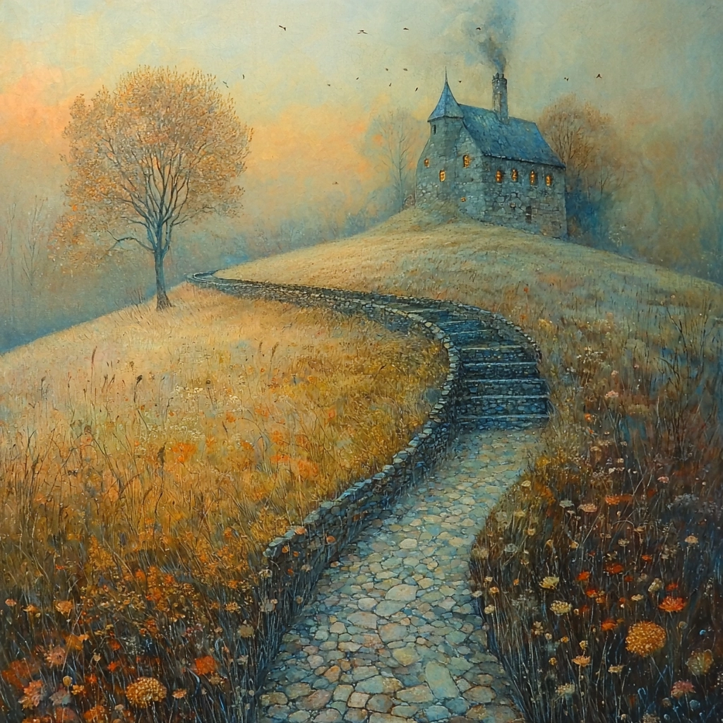 The lighting is subdued, subtly illuminating the scene and highlighting contrasts between orange highlights and cooler shadows. Curving paths create depth, leading the viewer's eye across textured surfaces, with a delicate glow convincing them of a misty atmosphere.