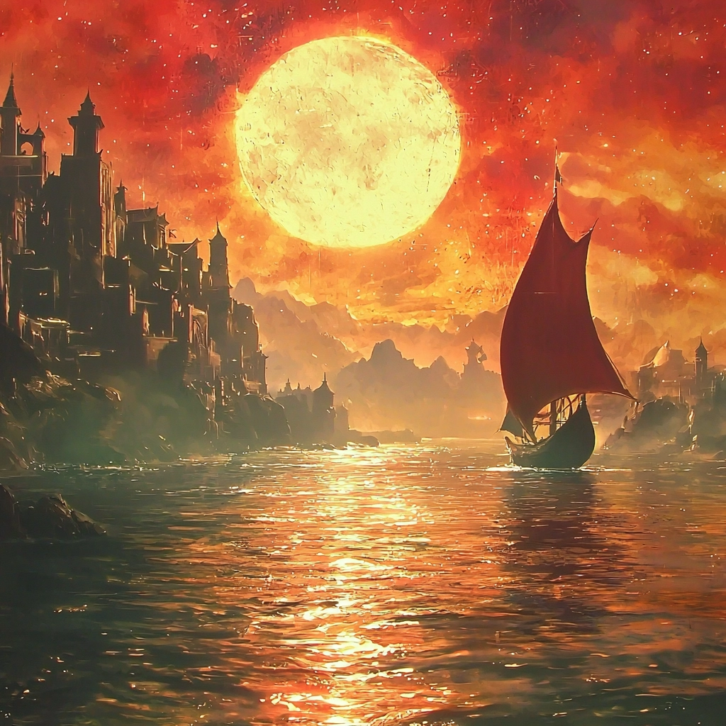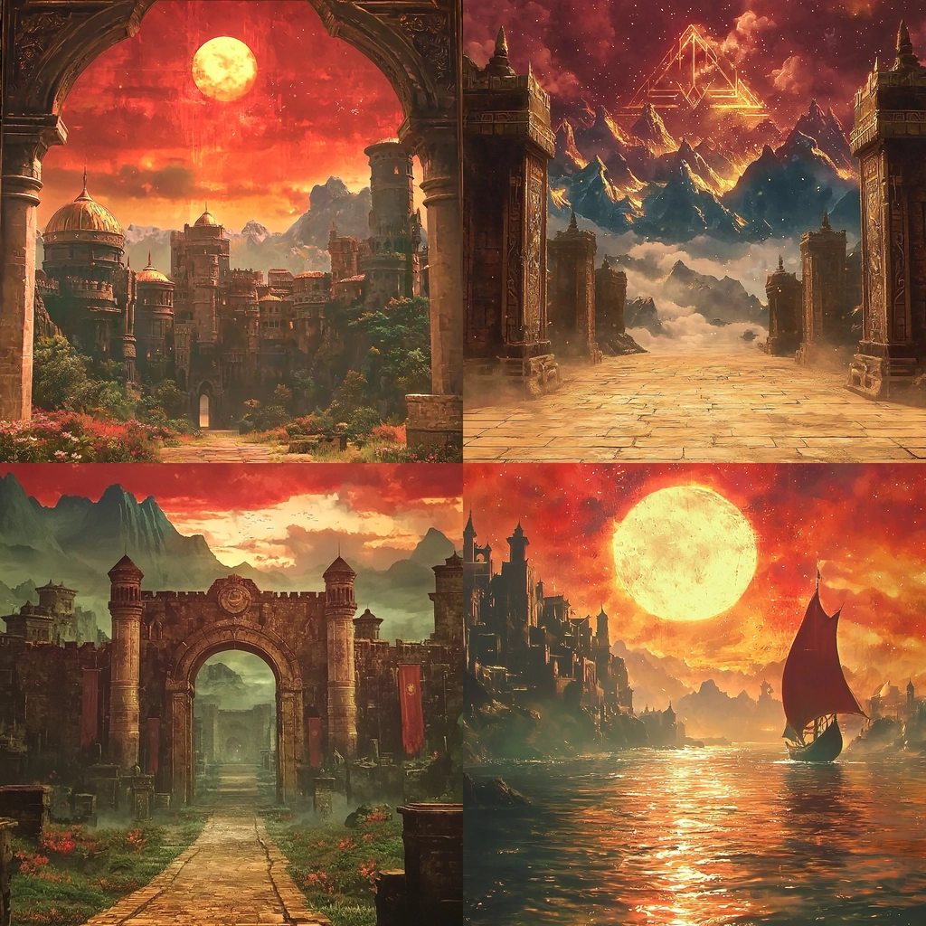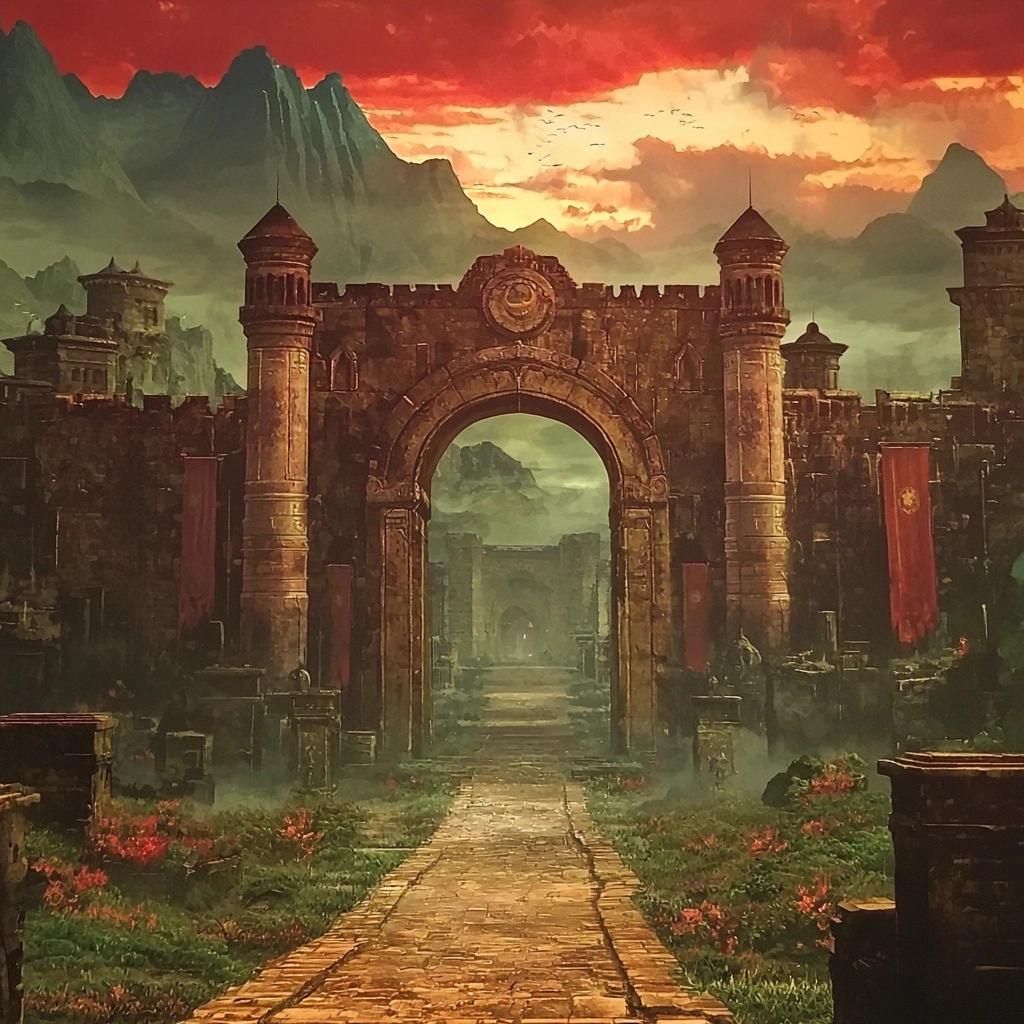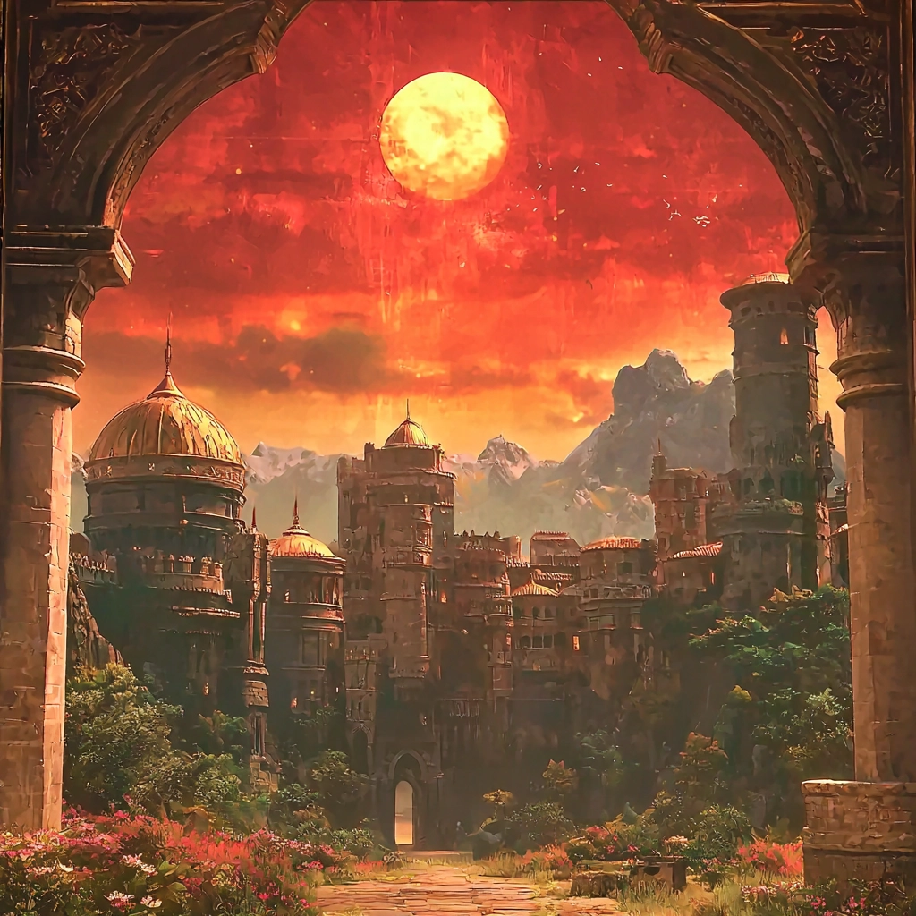 Lighting is dramatic, casting deep shadows with strong backlighting against architectural detail. Colors are dominated by warm reds, creating depth with rich contrast. Space feels vast yet intimate, with clear, varied textures across structures.