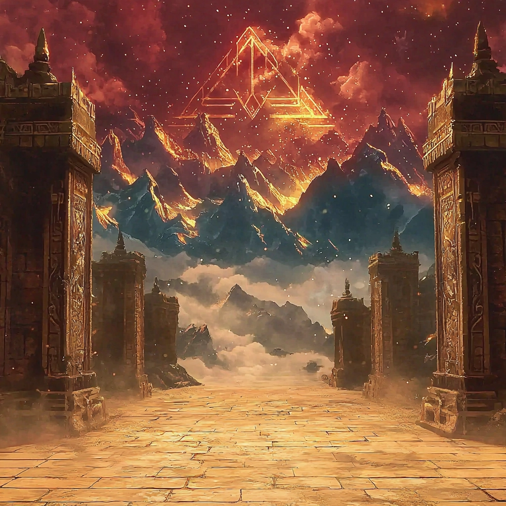 The composition emphasizes warm hues with stark contrasts against intricate architectural forms.