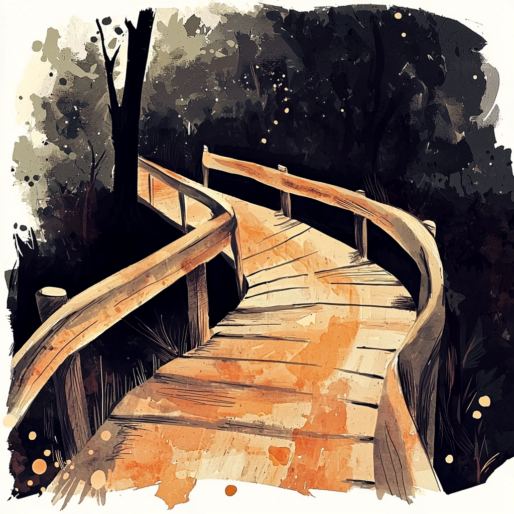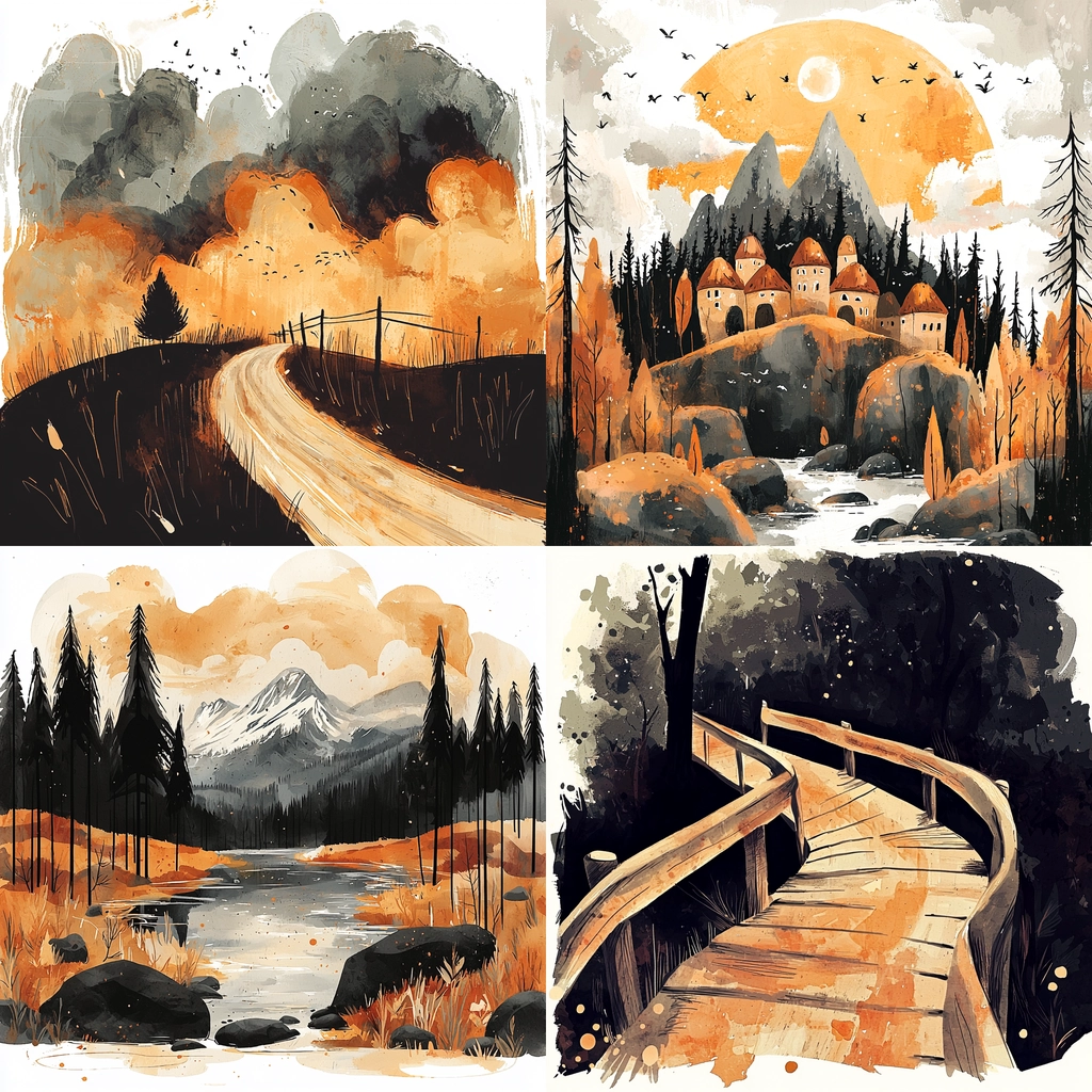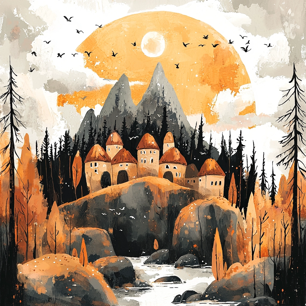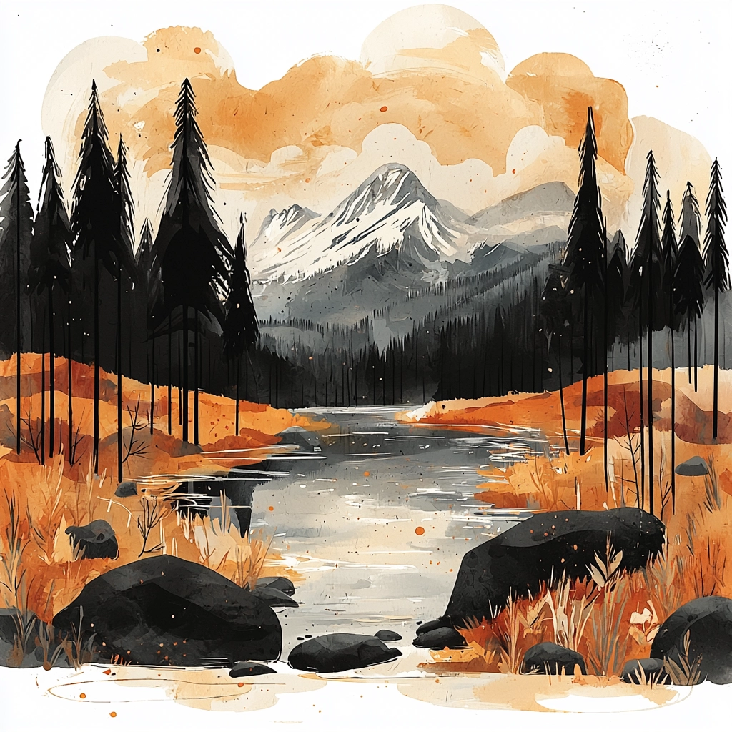 Lighting accentuates the warm oranges against deep blacks, creating depth. The use of contrasting light and dark areas generates dynamic spatial relationships. Textures are suggested through flowing brushwork that hints at both smooth and rough surfaces.