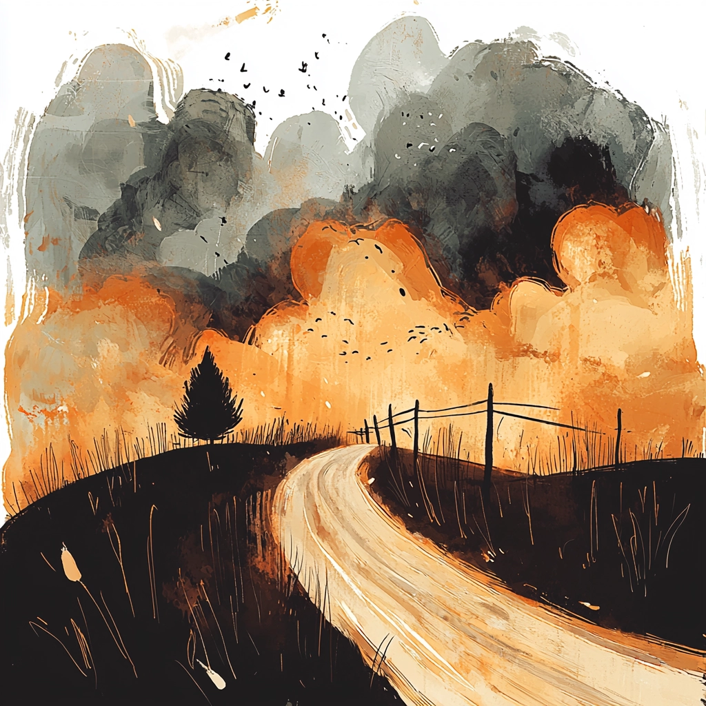 Dynamic brushstrokes evoke movement with dominant warm hues.
