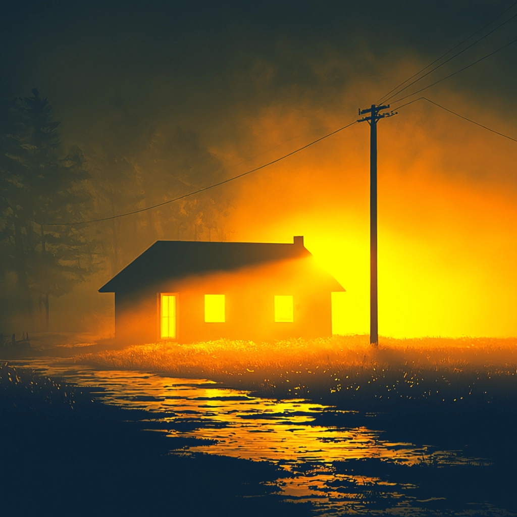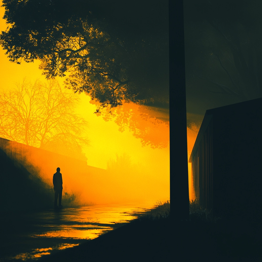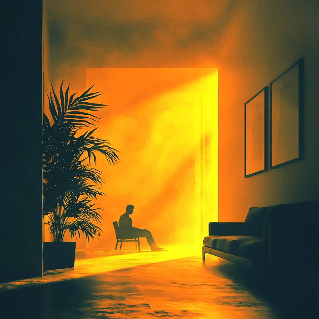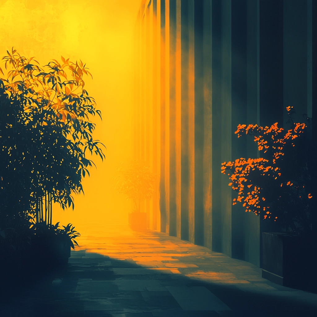 Strong, angular lighting casts dramatic shadows, creating a vivid contrast between illuminated and shadowed areas. The use of warm orange hues mixed with deep blacks enhances the visual depth, giving the scene a bold and immersive atmosphere.