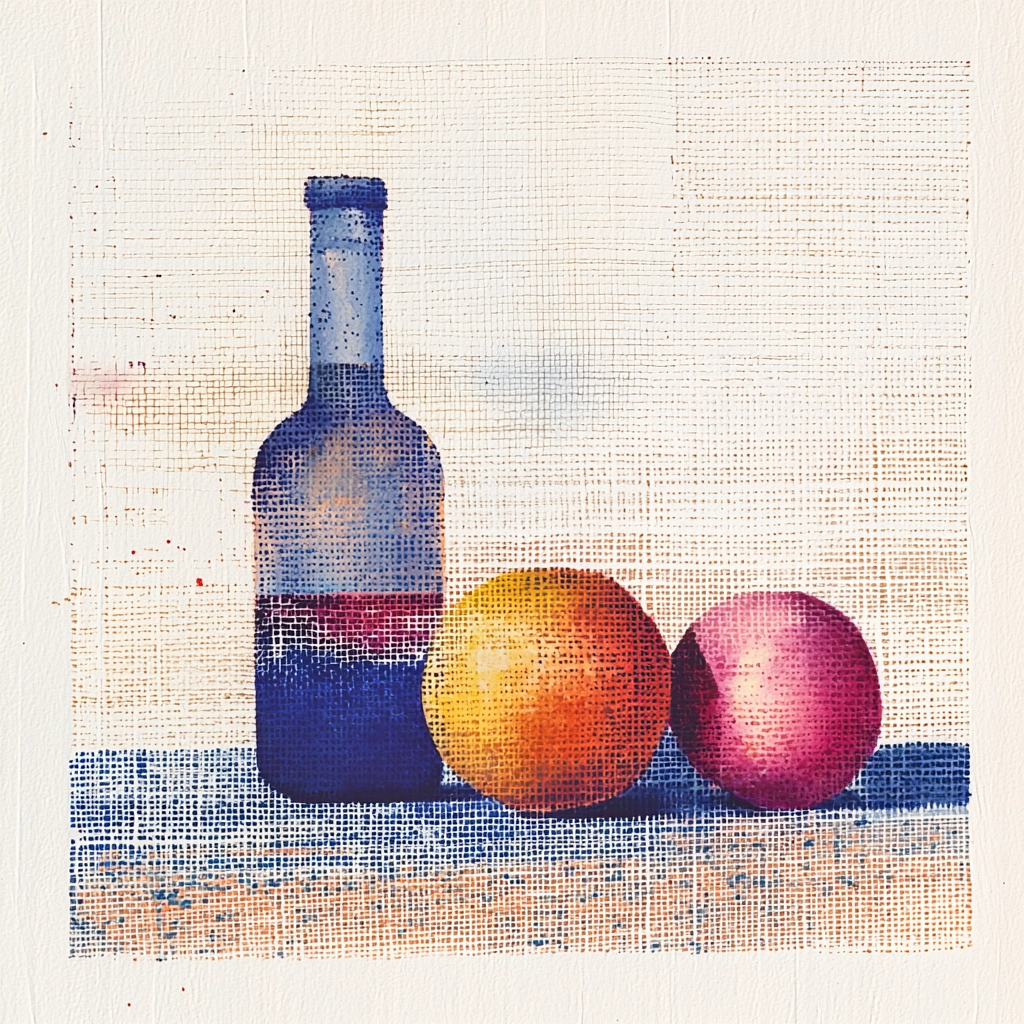 The lighting plays with shadowy contrasts, highlighting the warm hues against a textured background. Blues appear cooler, offset by softer oranges and purples. The spatial arrangements suggest a layered visual narrative, conveying depth through gradients.