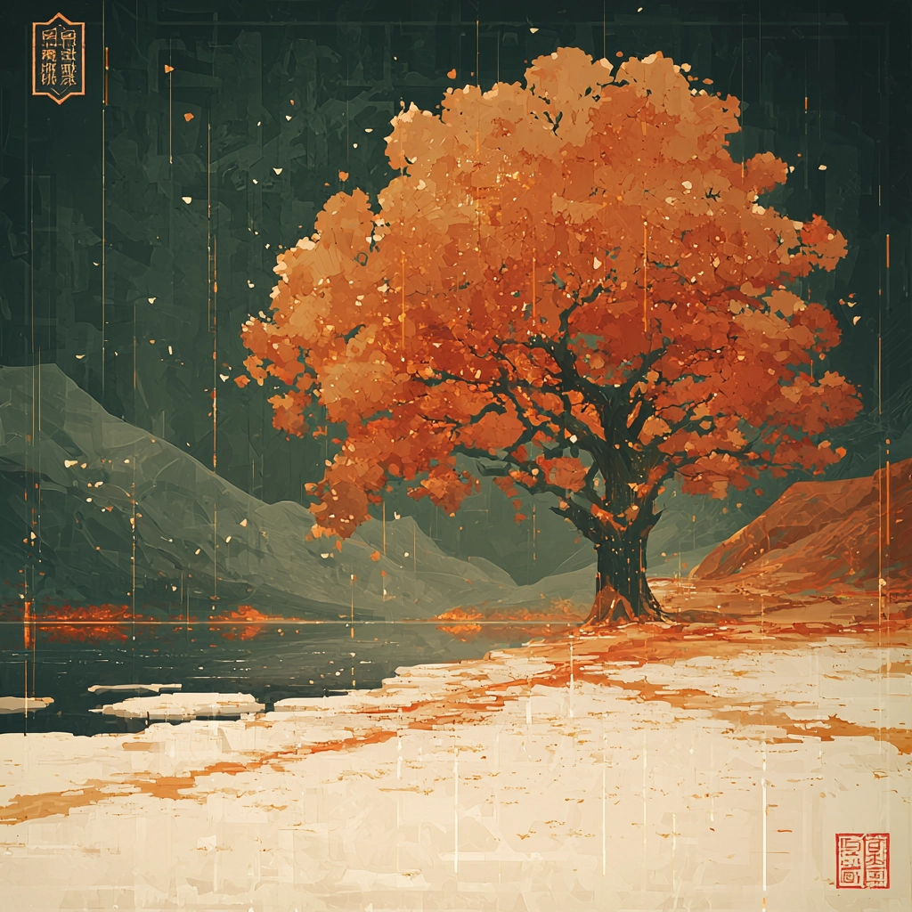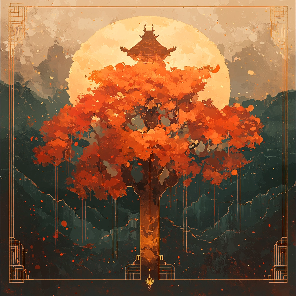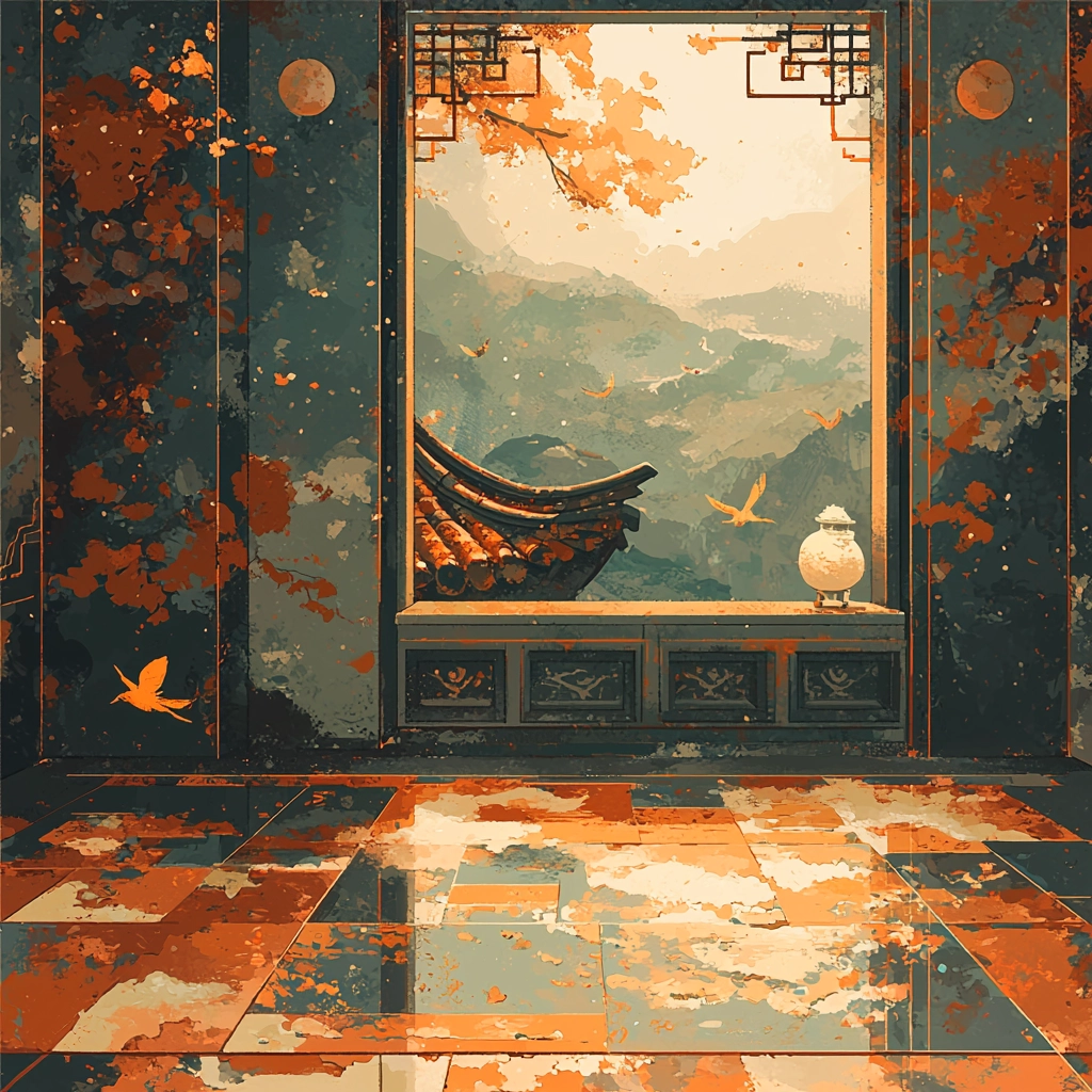 The composition is unified by autumnal hues and balanced lighting contrasts.