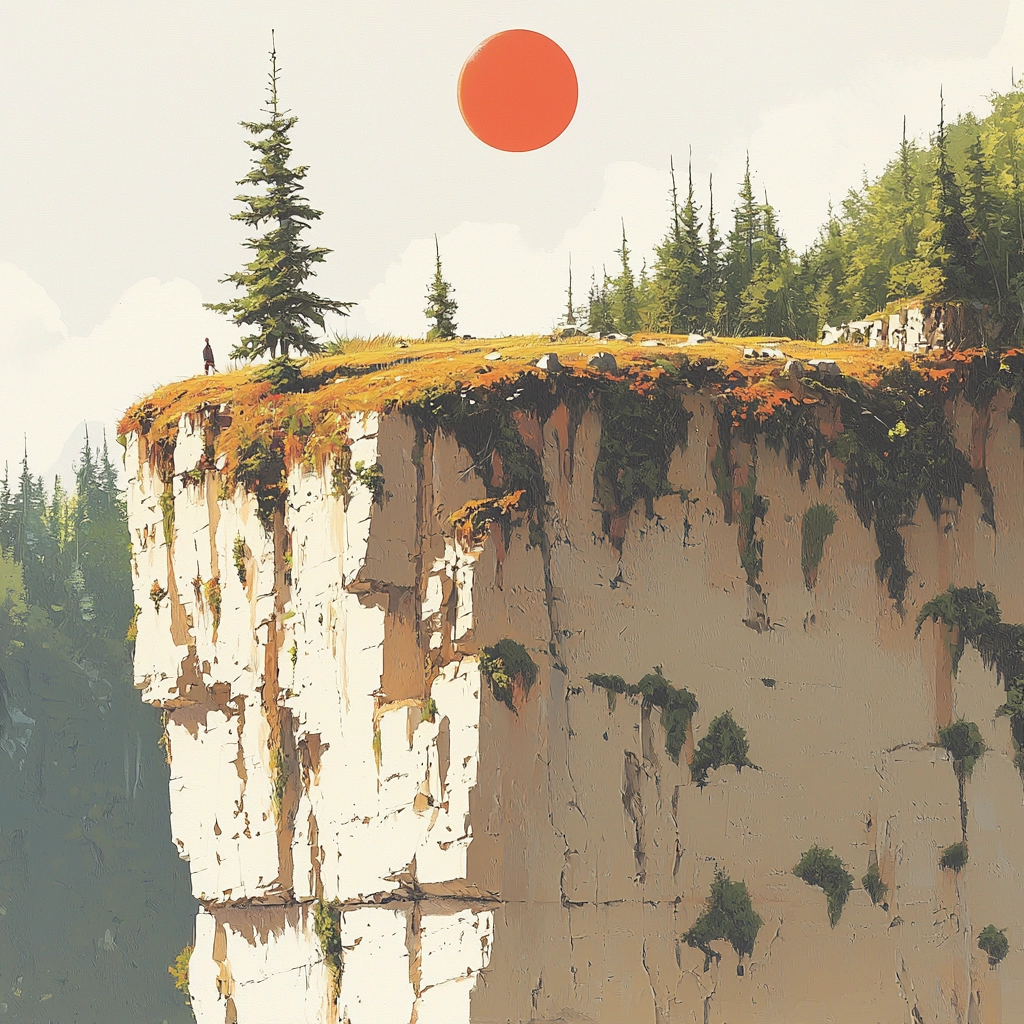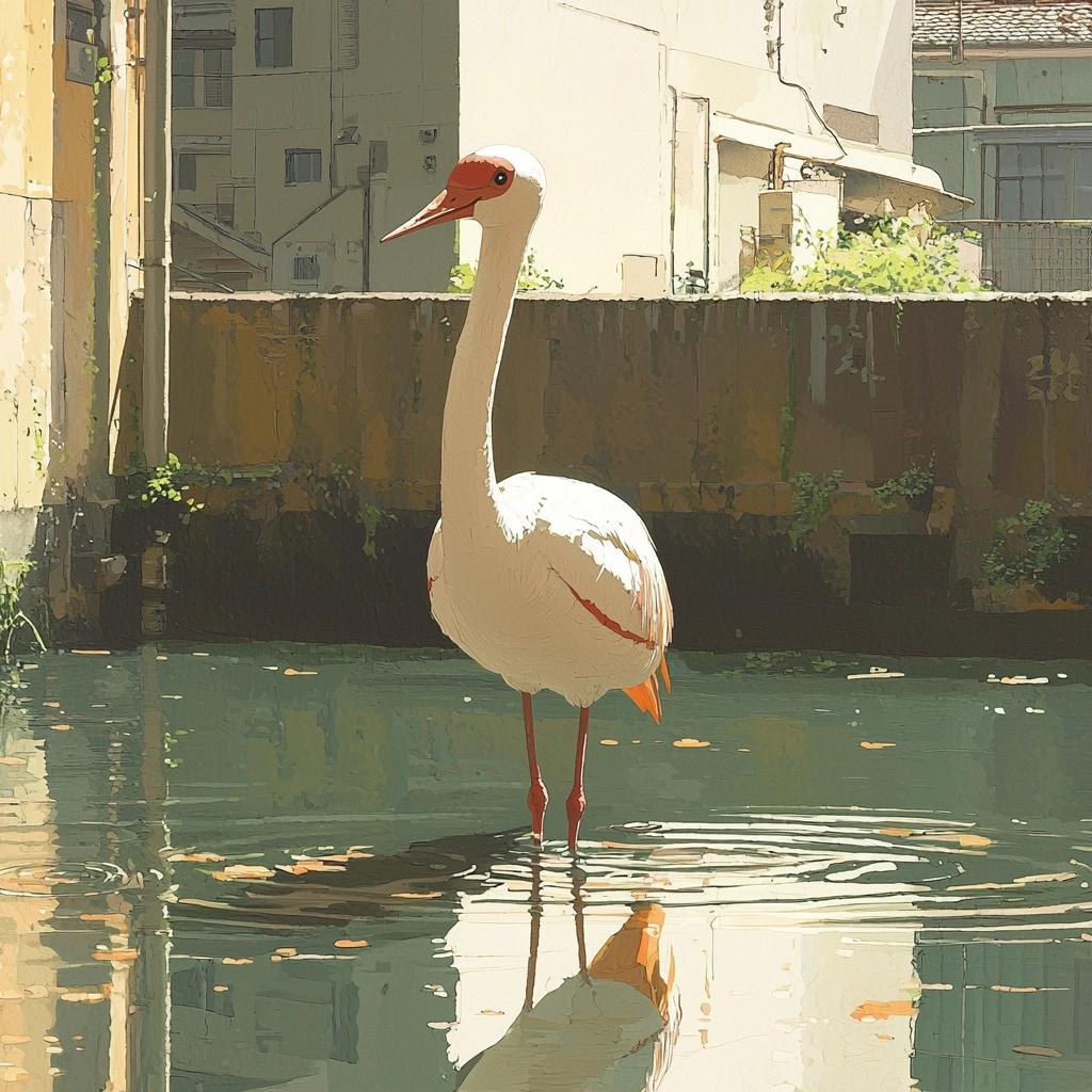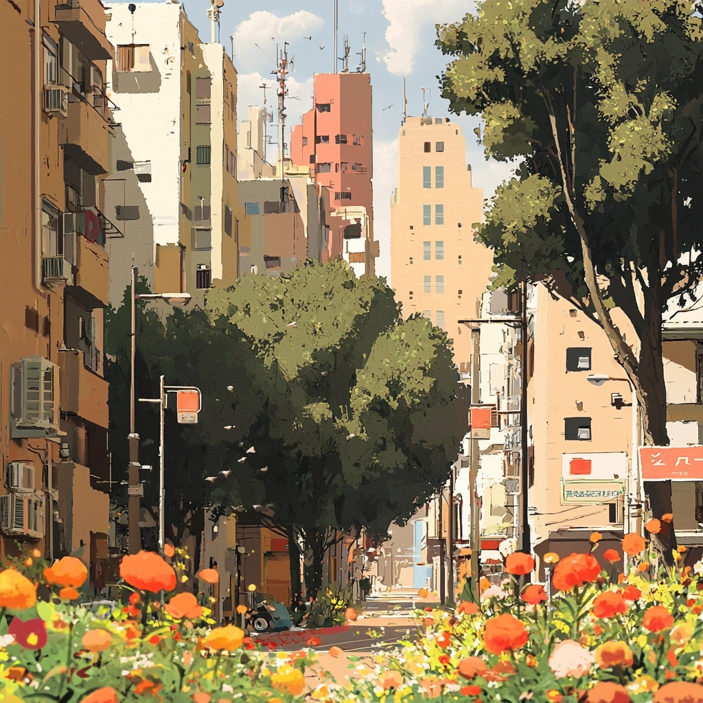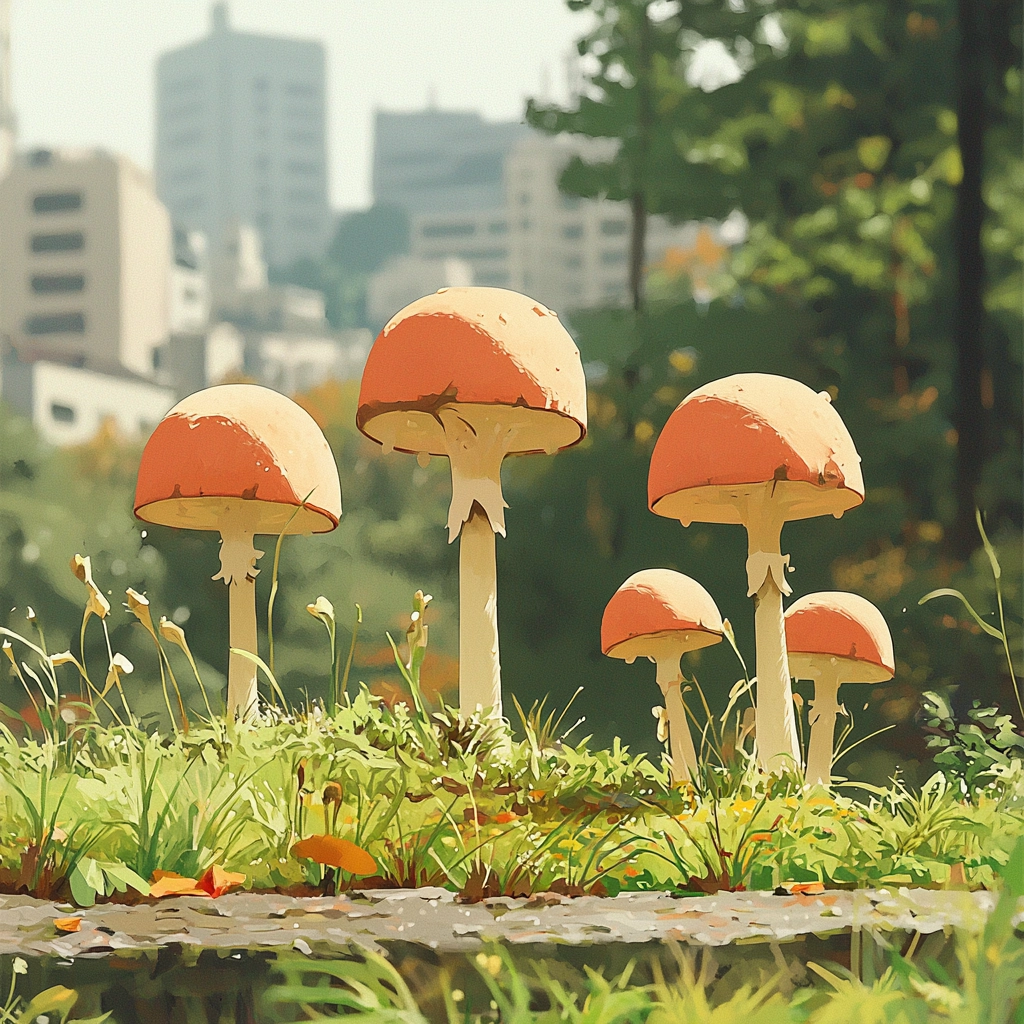 The lighting is soft and natural, with sunlight filtering through various elements enhancing the color depth of orange and green tones. Textures are well-defined, providing a layered spatial sense that merges urban and natural environments seamlessly.