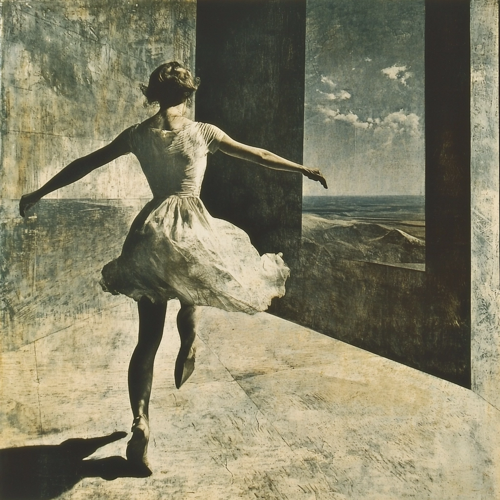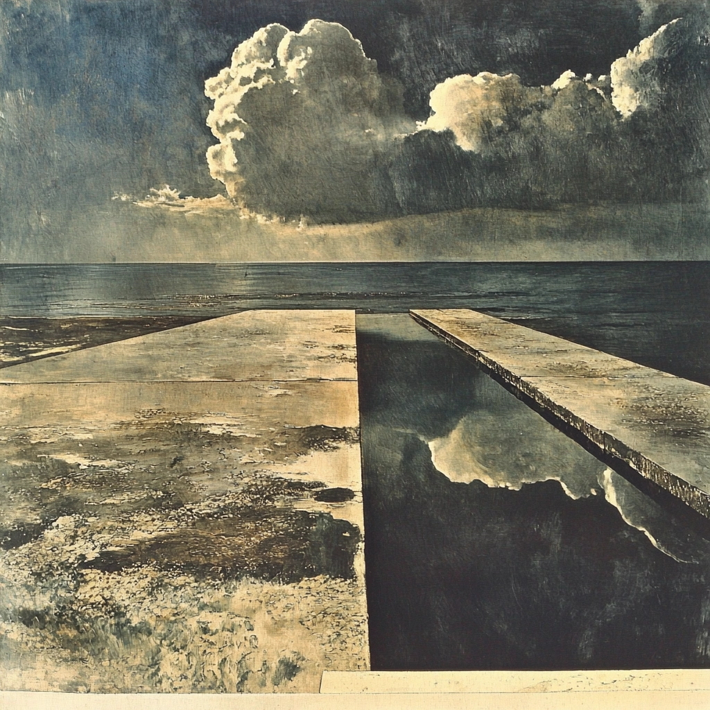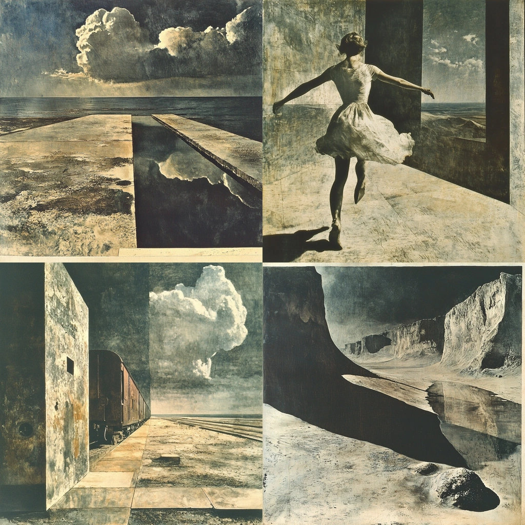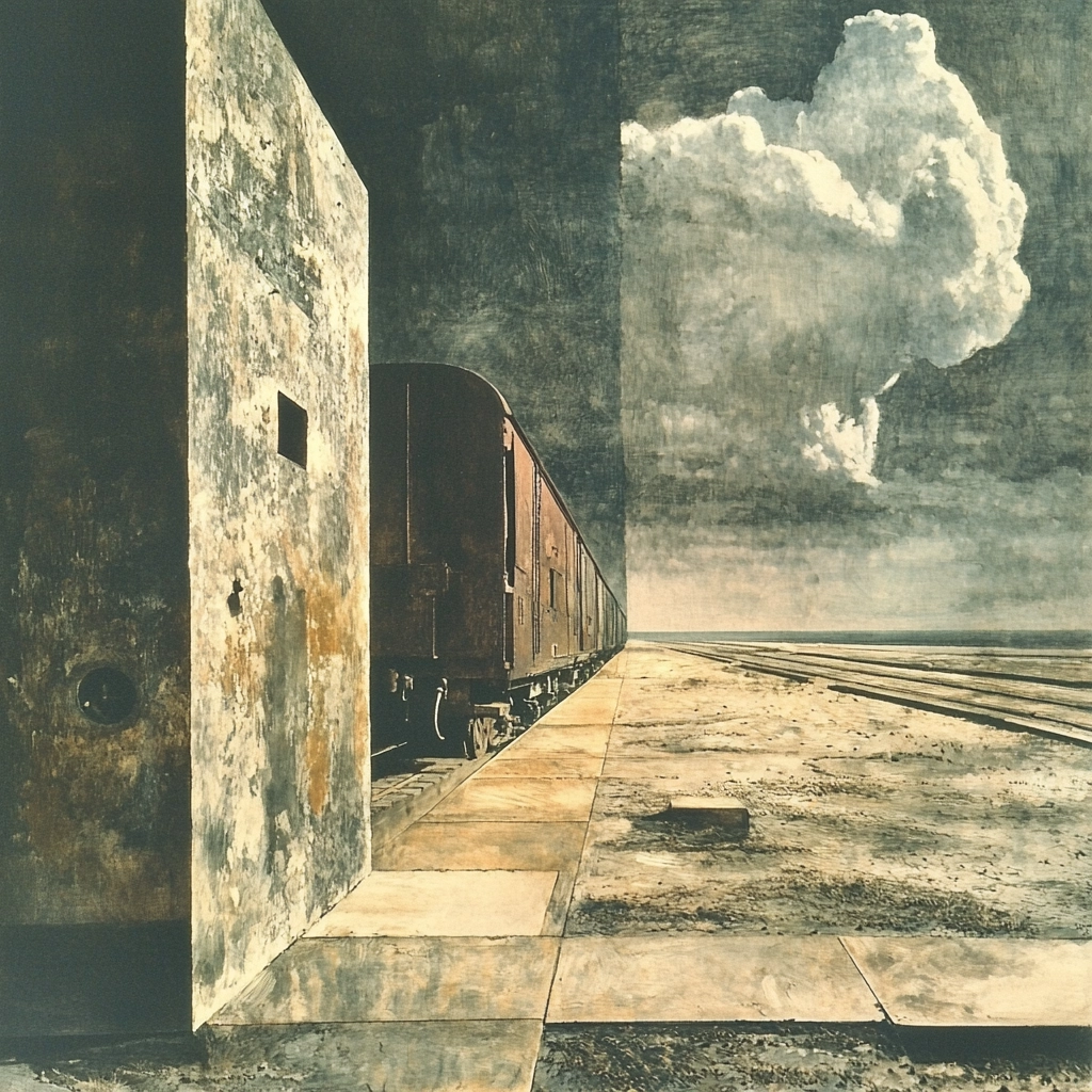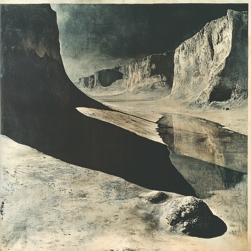 The lighting emphasizes dramatic contrasts, creating deep shadows and highlights. The palette consists of muted grays and beiges that evoke a weathered texture. Layers of space are suggested by strong shadow play, adding to a visually dynamic composition.