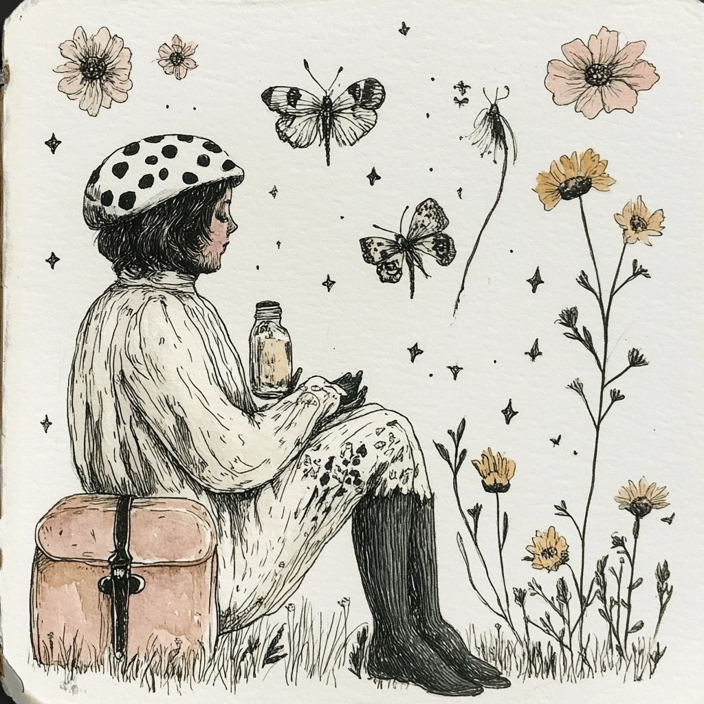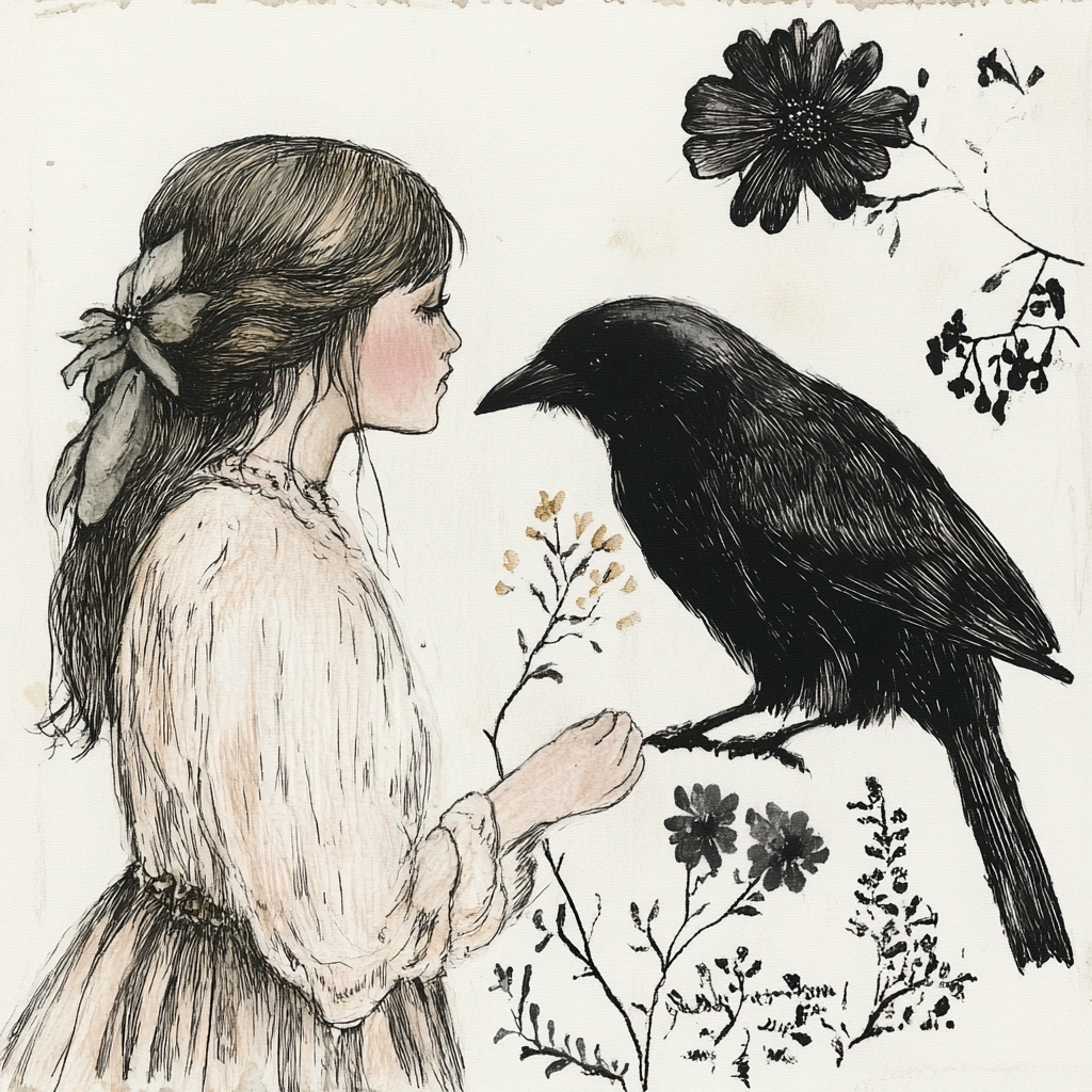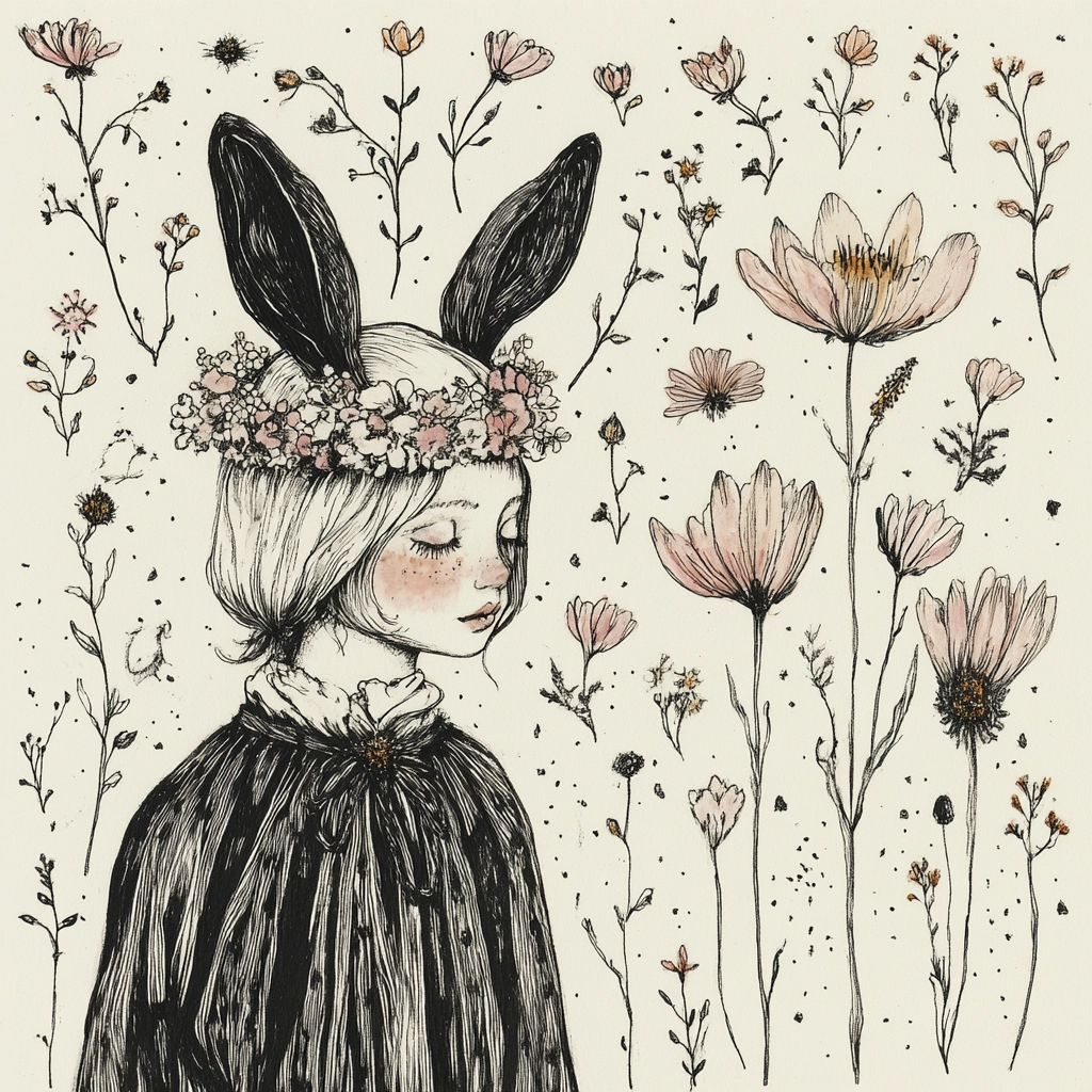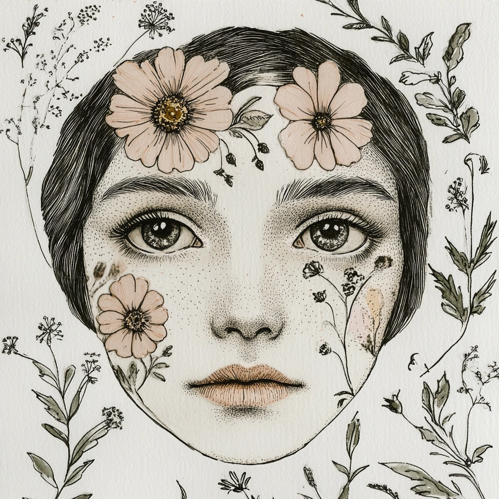 Ink outlines with delicate botanical details create a gentle harmony.