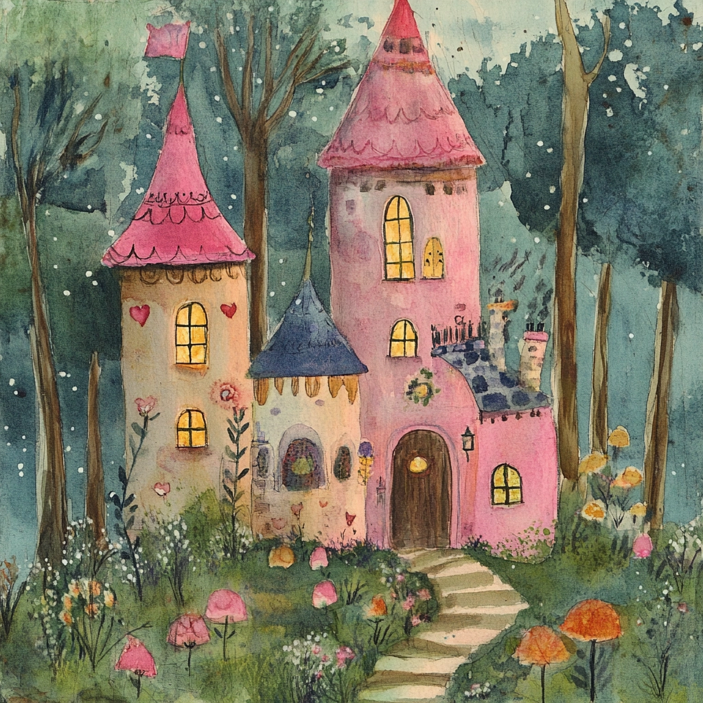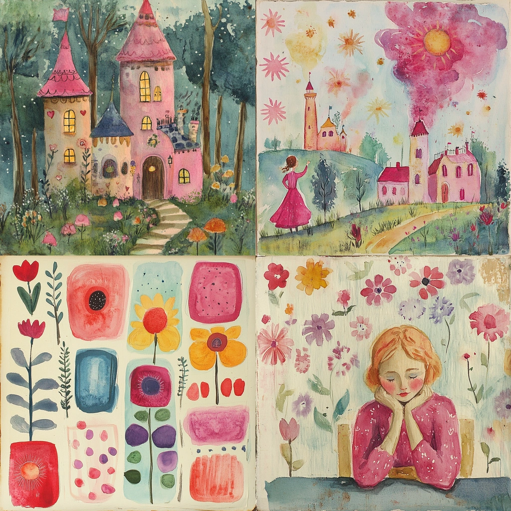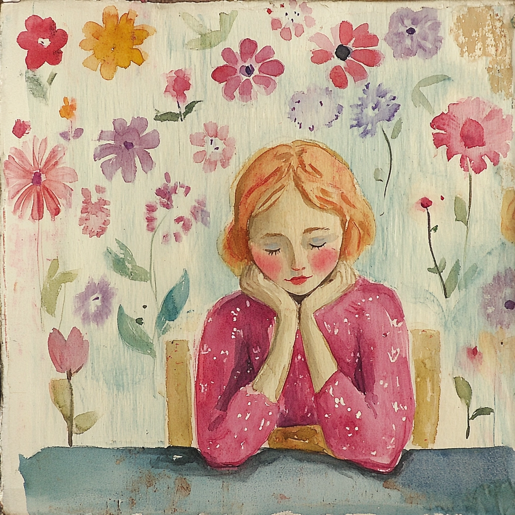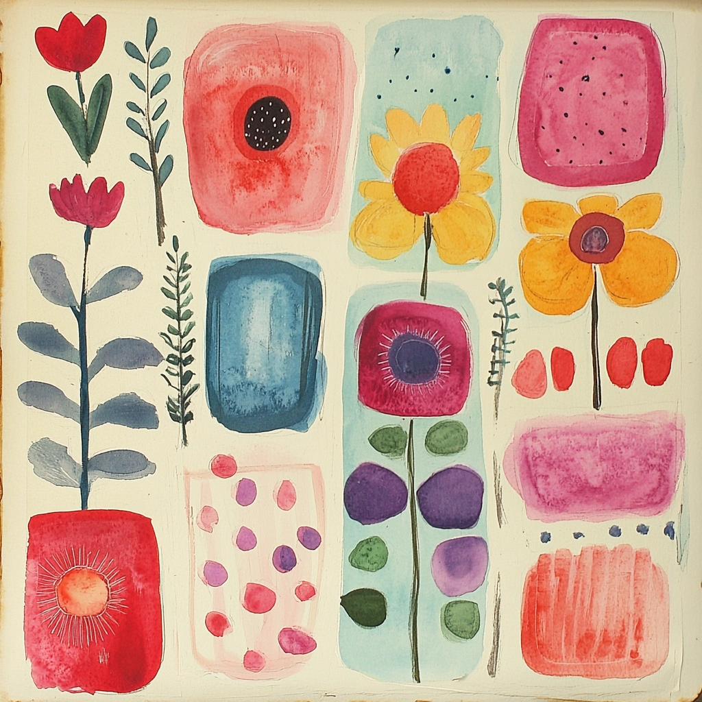 Playful use of light brings out vivid colors against softer hues, creating depth. The texture is fluid with an emphasis on organic forms and playful outlines, enhancing a sense of gentle movement.