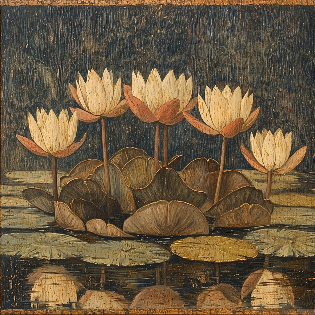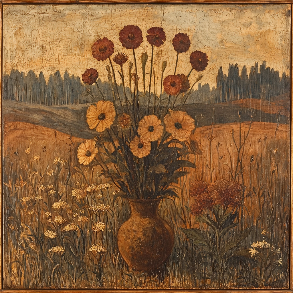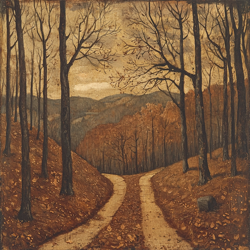 The lighting is muted, lending a soft warmth to the earthy palette. Browns and beiges dominate, emphasizing natural textures with fine nuances. Spatial depth is achieved through balanced, detailed compositions.
