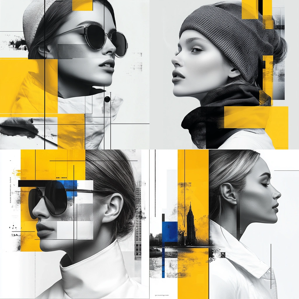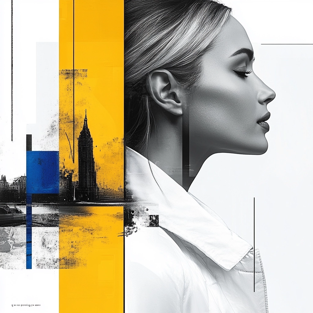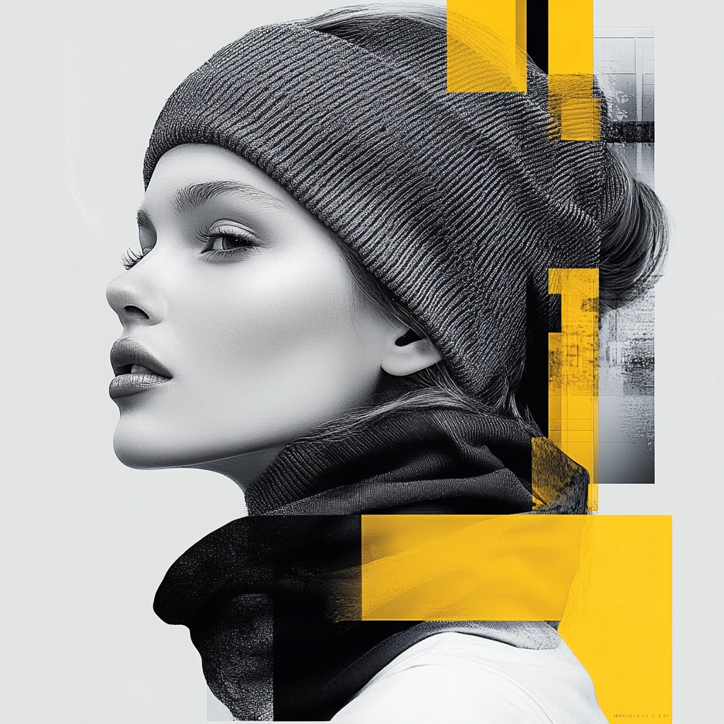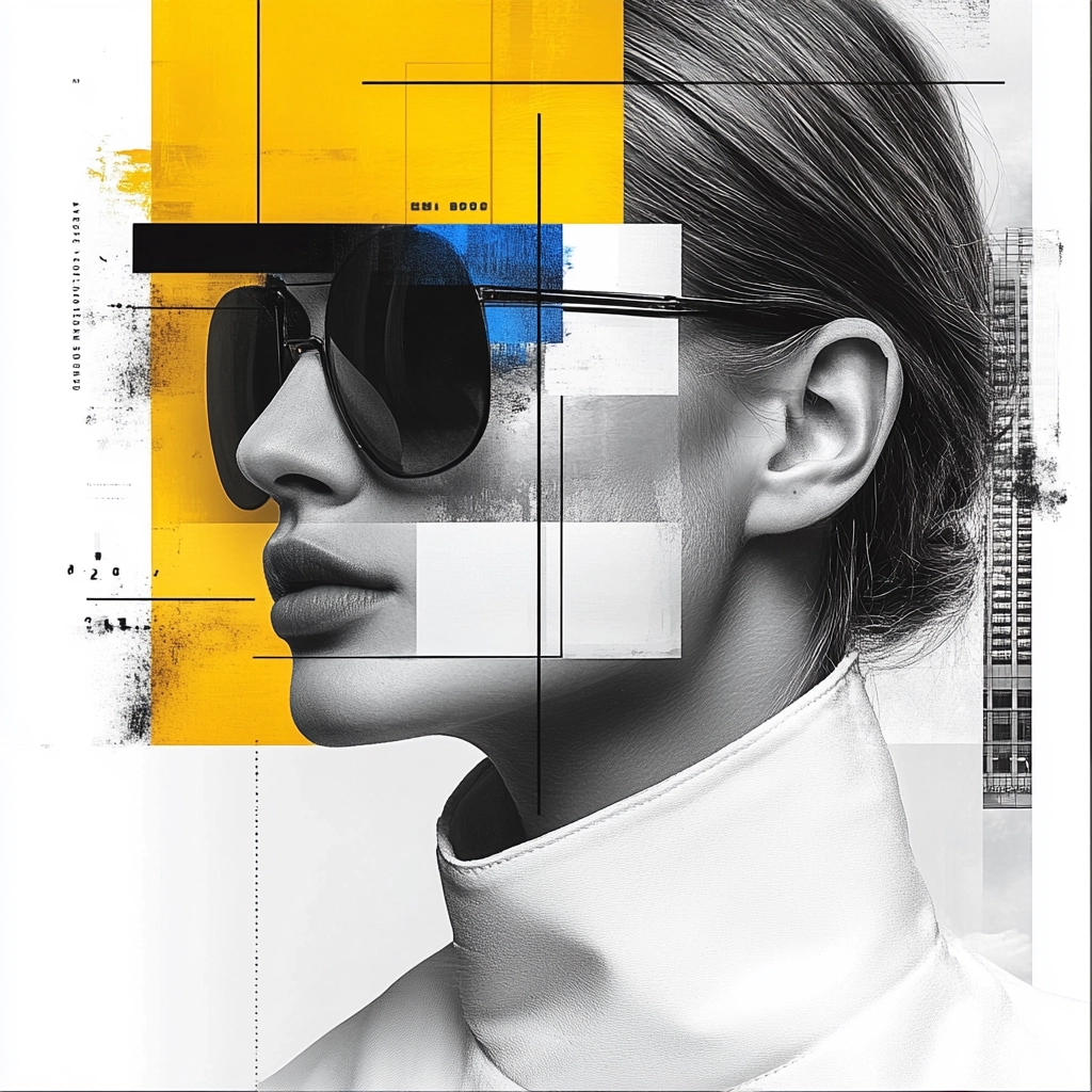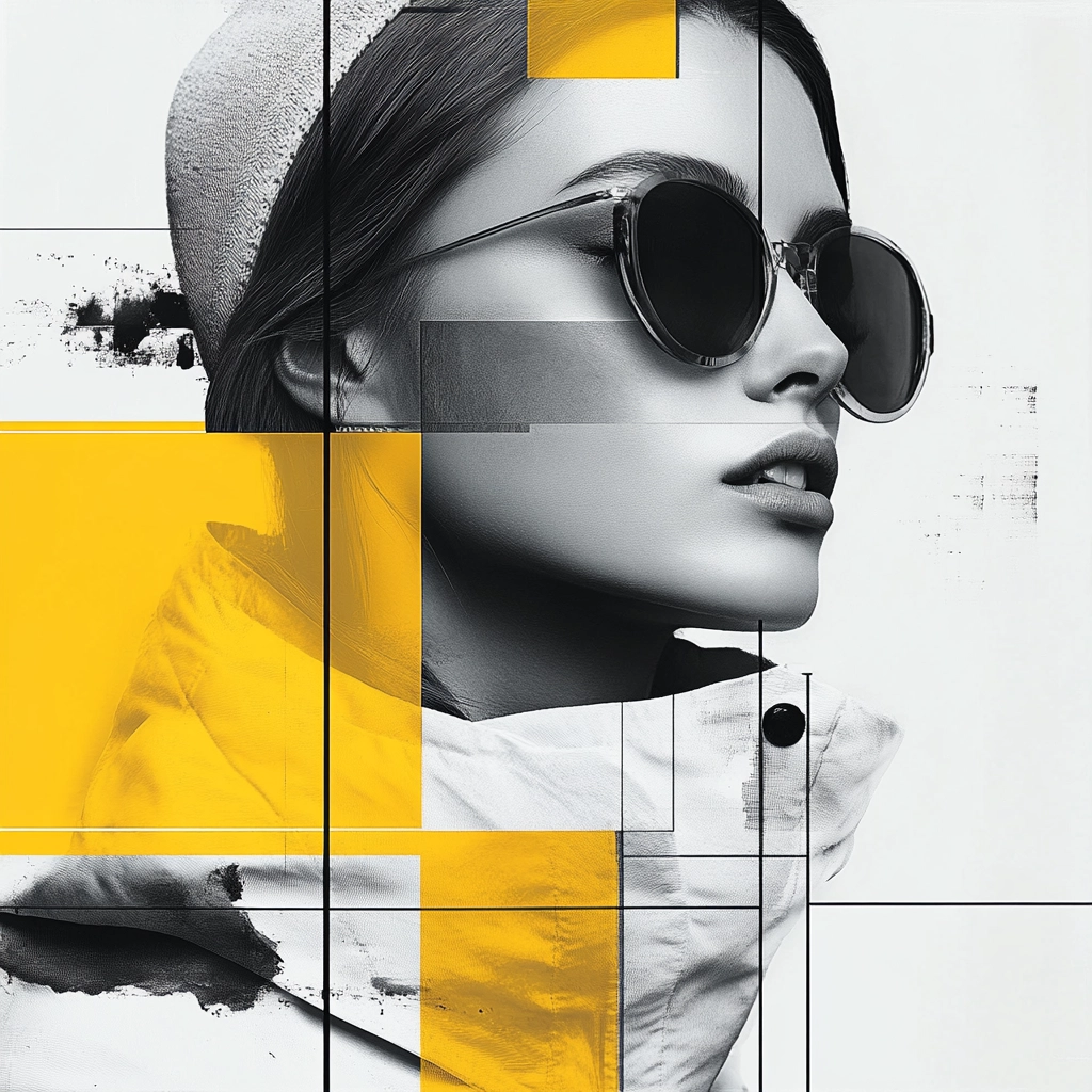 Strong lighting contrasts highlight the bright yellow accents, enhancing the sharp, geometric lines. The spatial composition feels structured and balanced, with a blend of clean forms and graphic textures.